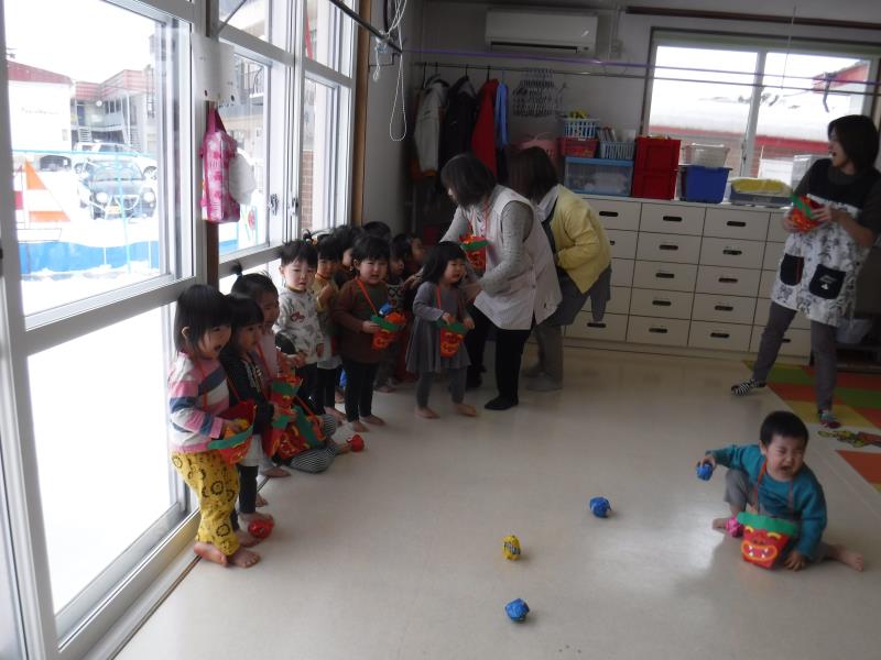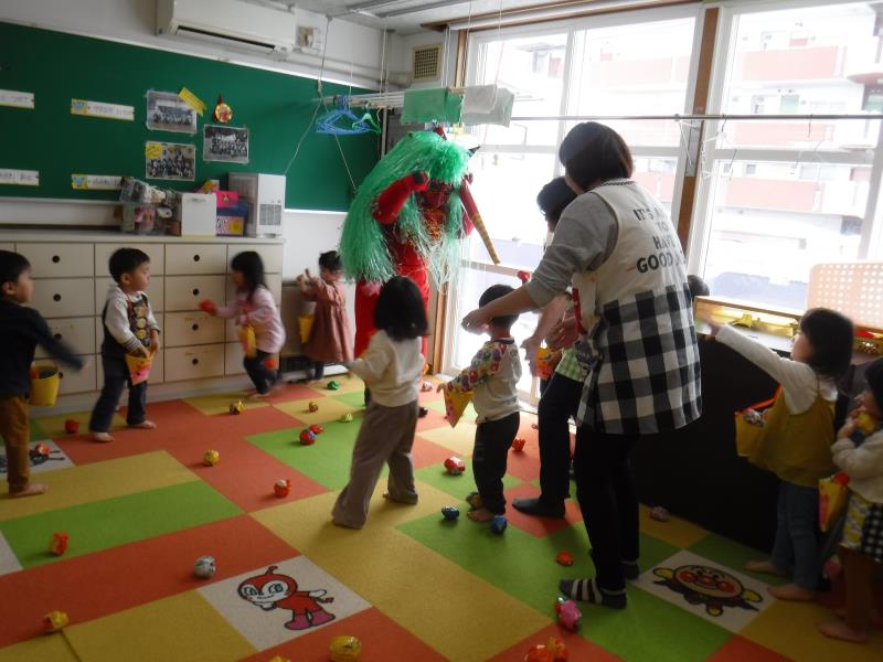 先生にしがみつく子、大泣きする子、とにかく逃げようとする子、一生懸命豆をなげる子…と、小さいお友達も頑張っていました。