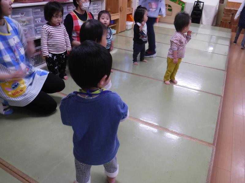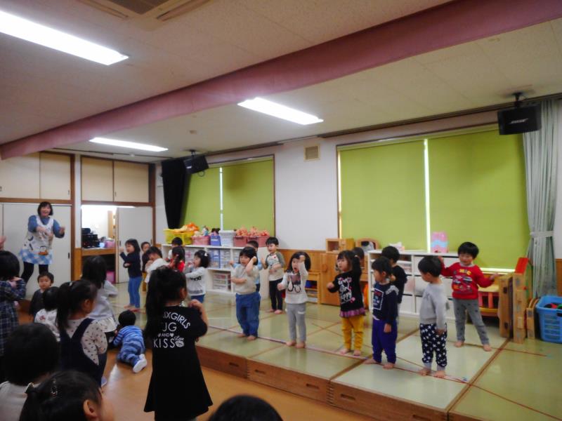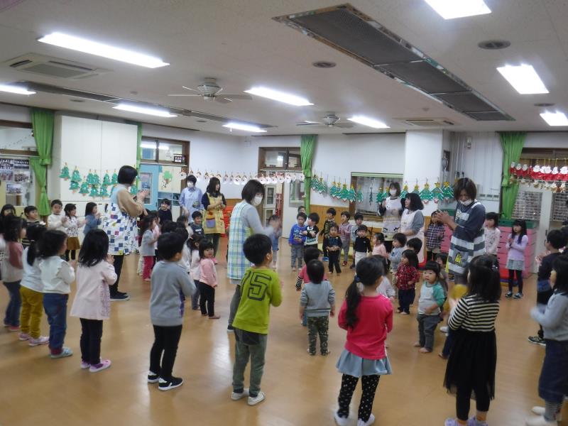 夕方の時間、お遊戯室で「ジングルベル」の曲に合わせて踊りの練習をしました。