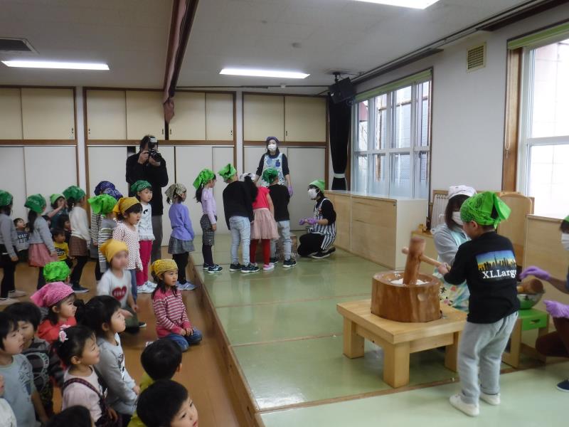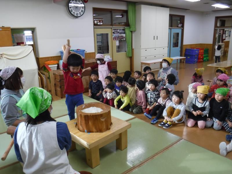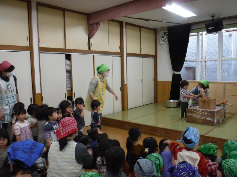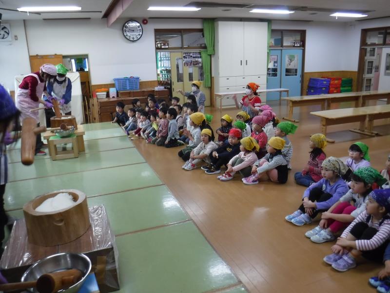 園長先生から明日のもちつきに向けて、「どうしておもちつきをするのかな?」というお話を聞きました。