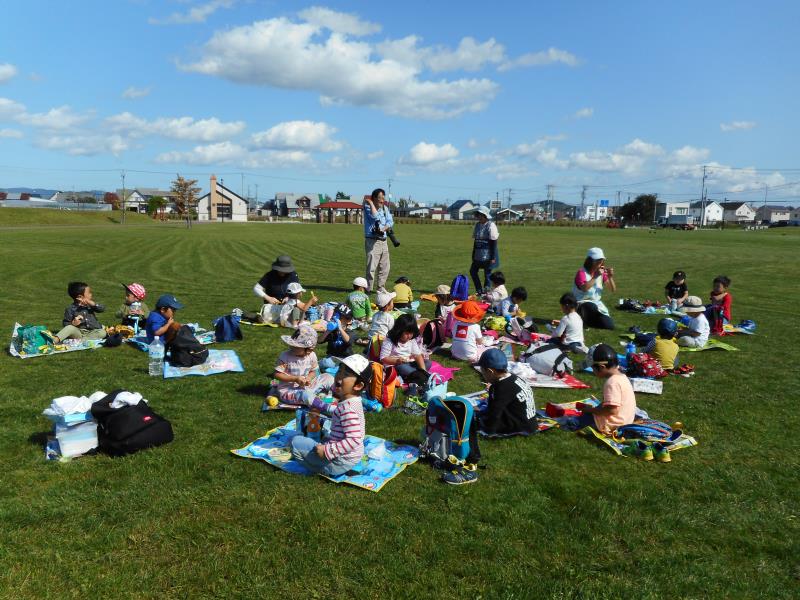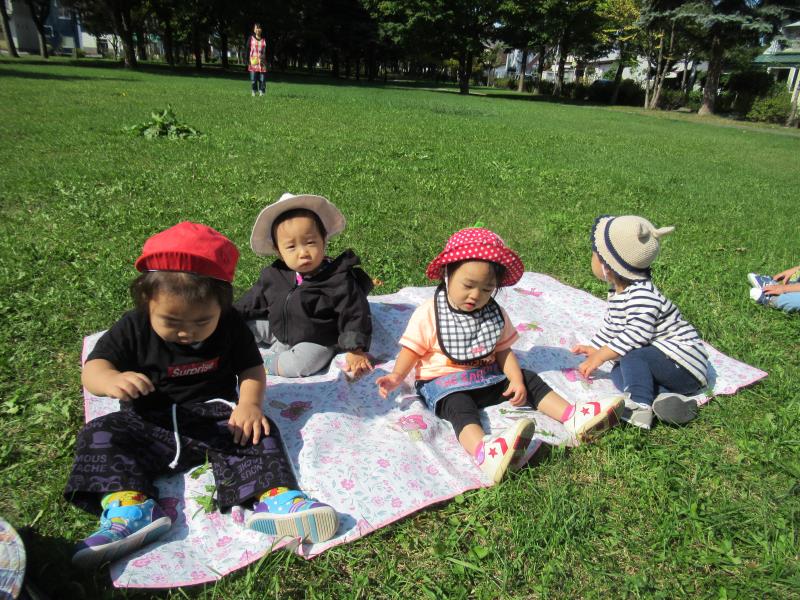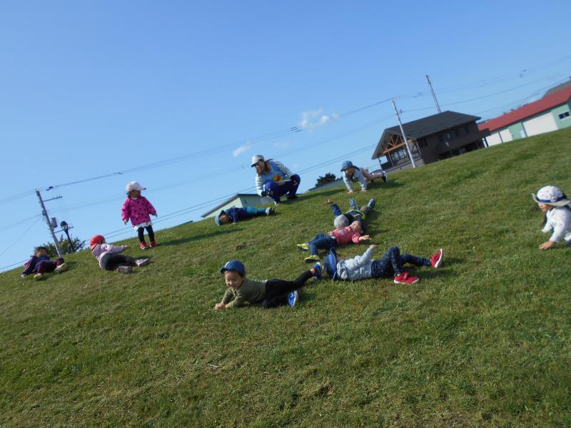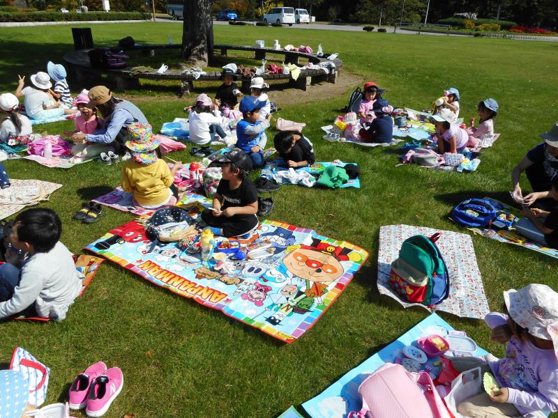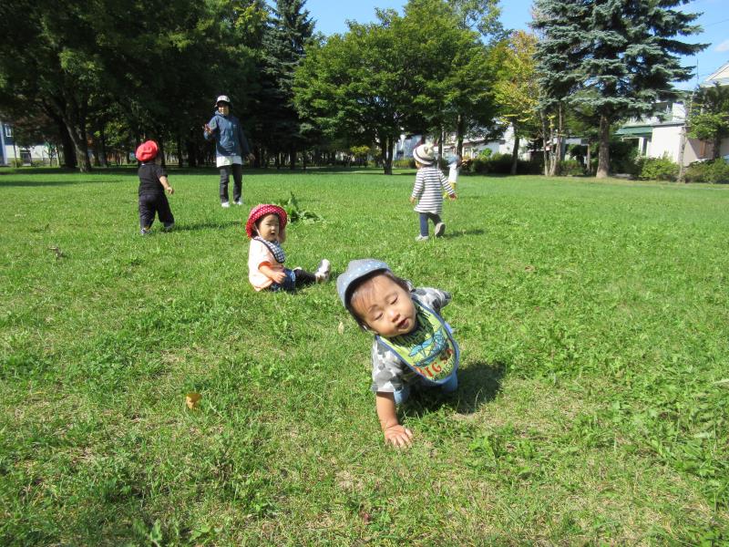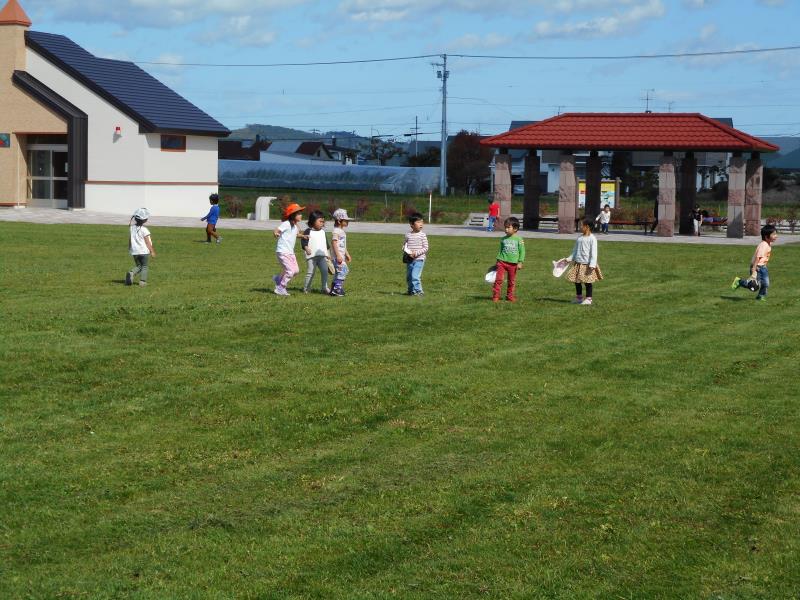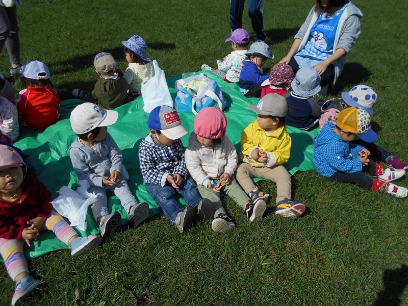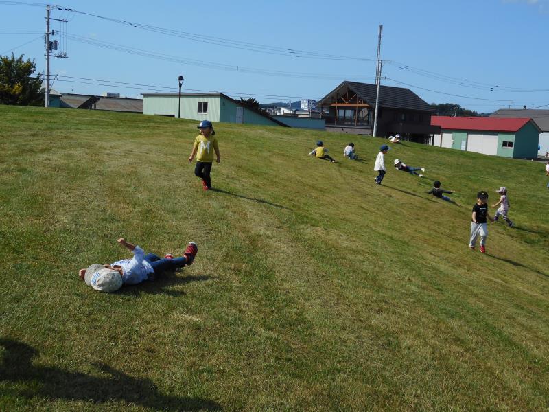 遊具で遊んだり、坂からコロコロ転がったり、トンボを追いかけたり…体を動かして遊んだ後は、公園でお弁当をいただきました!