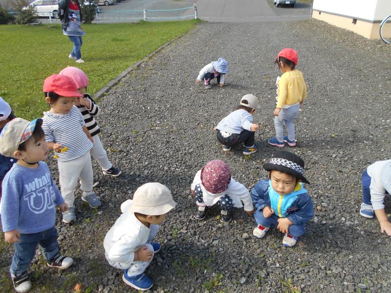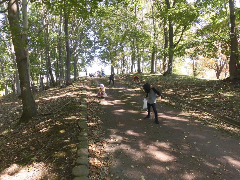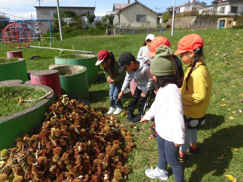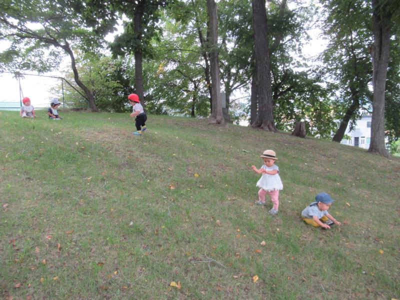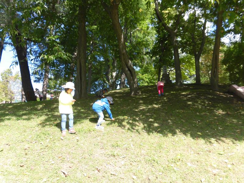公園の坂をお友達と駆け下りて体を動かしたり、栗の殻を大量に見つけたりしました。