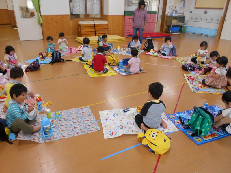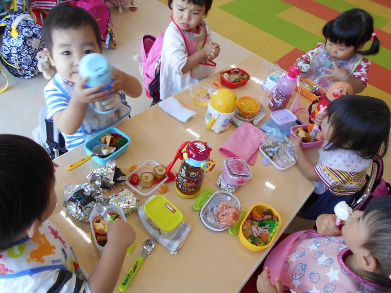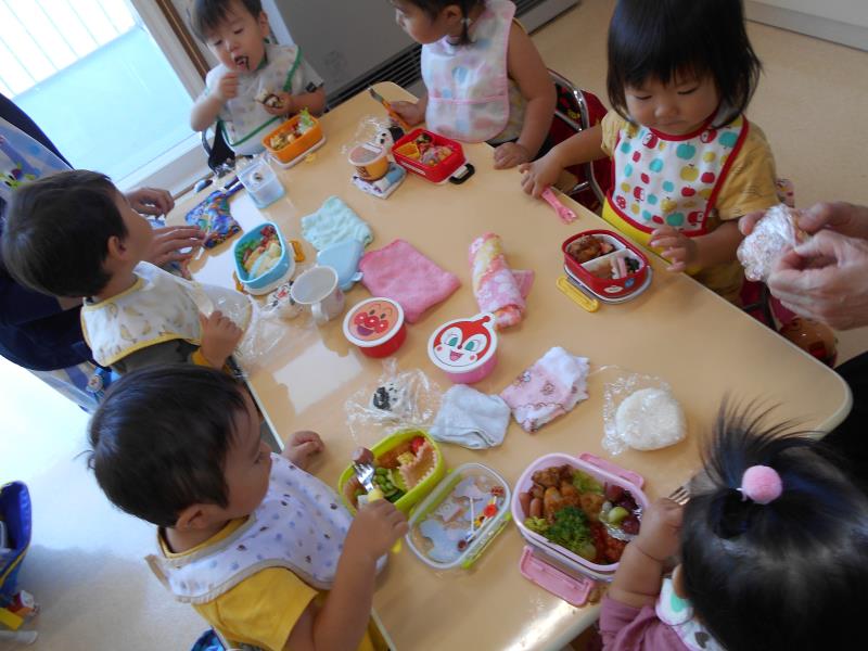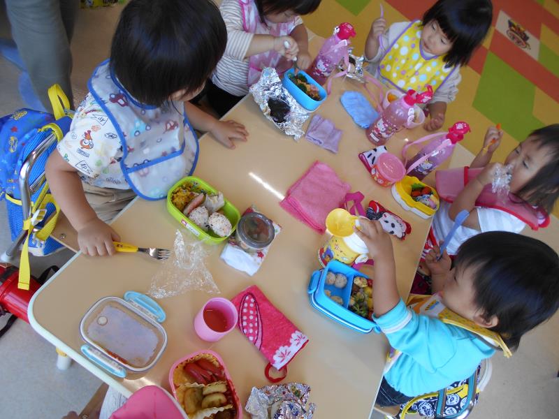 たんぽぽさんは広い公園でたくさん遊んだ後、園に帰ってからお弁当をいただきました。