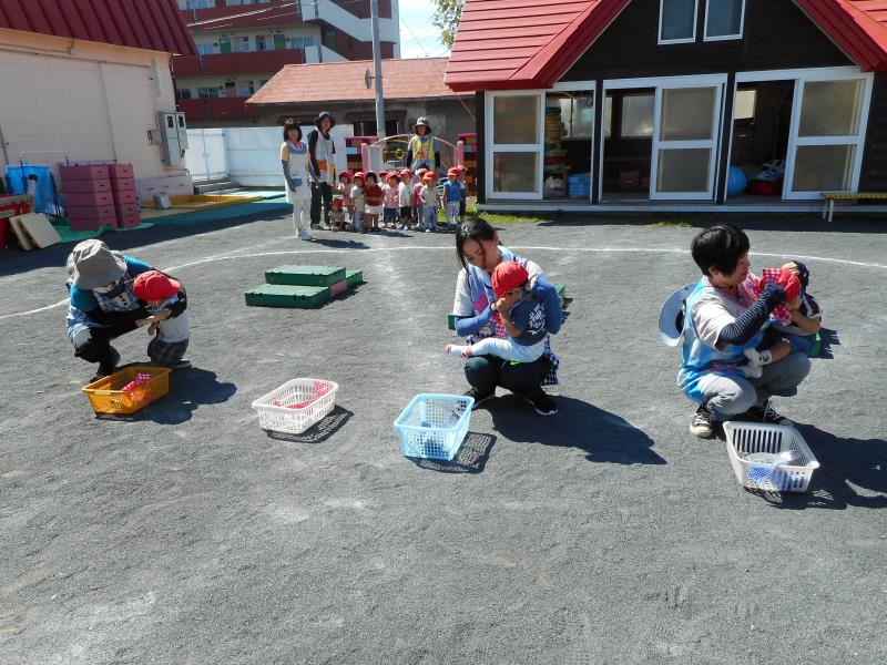 今日は、もも・ちゅうりっぷ組の親子競技、たんぽぽ組の親子競技、ゆり組の親子競技を行いました。