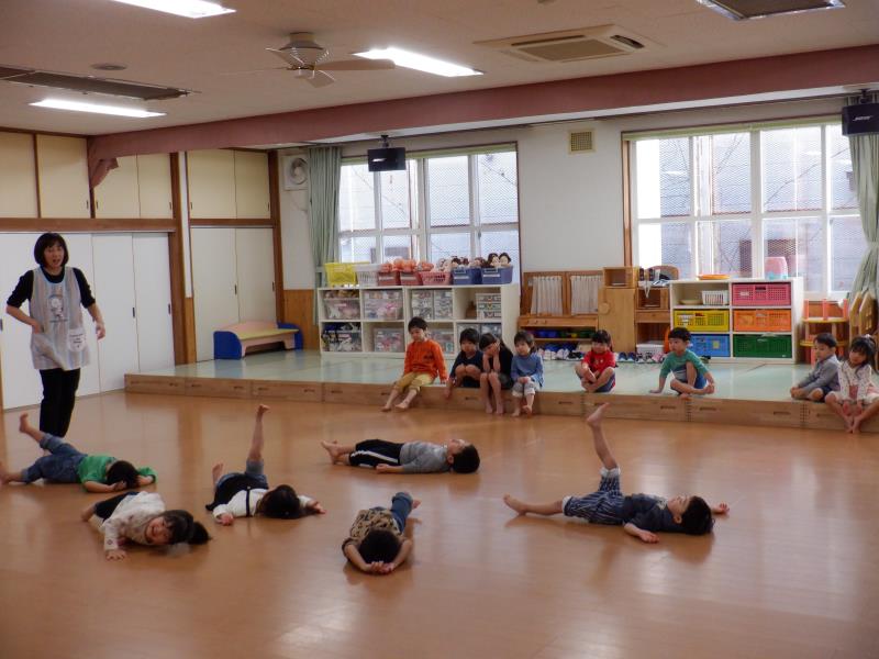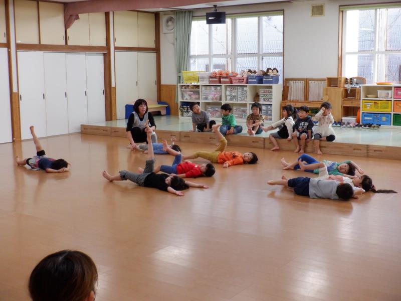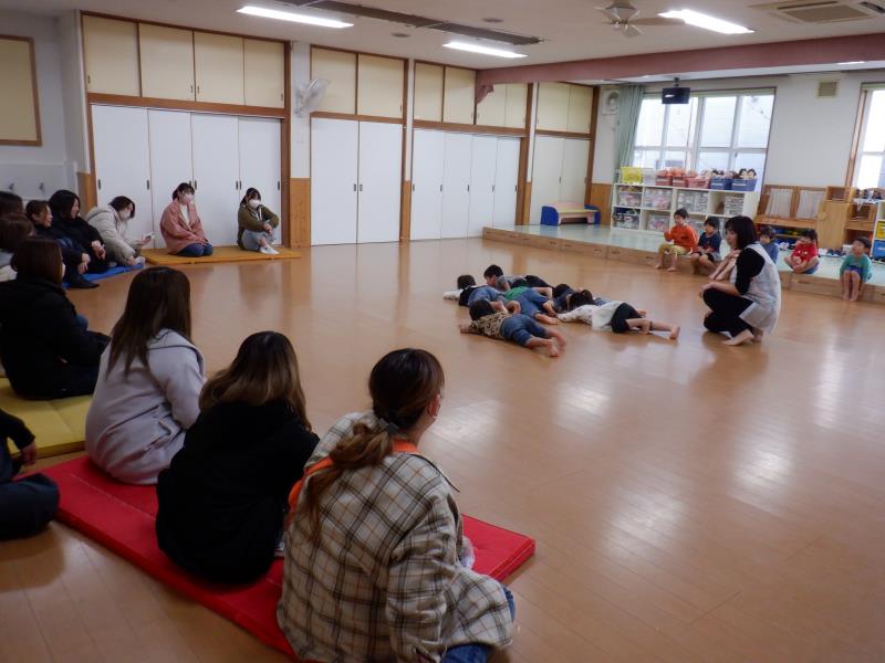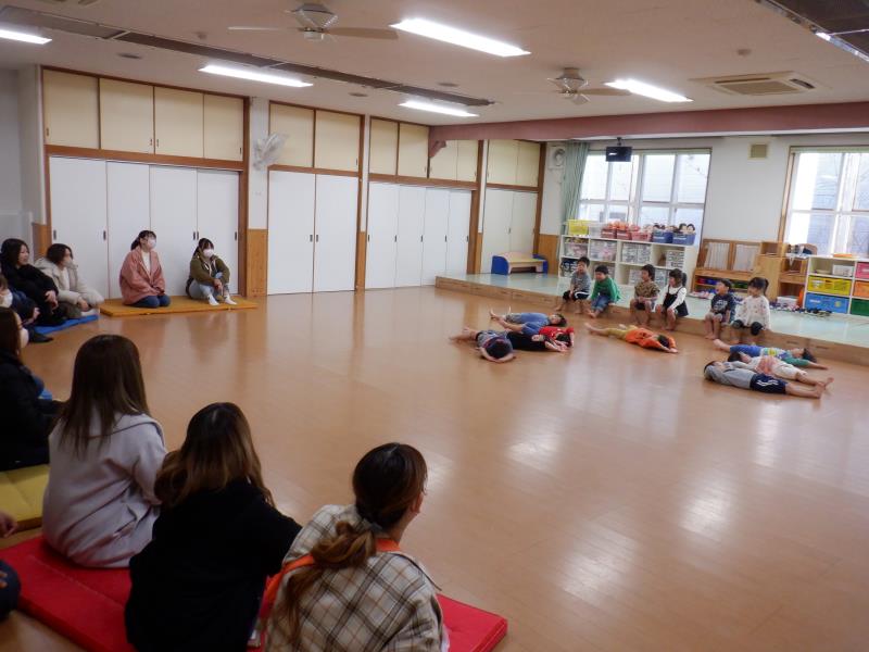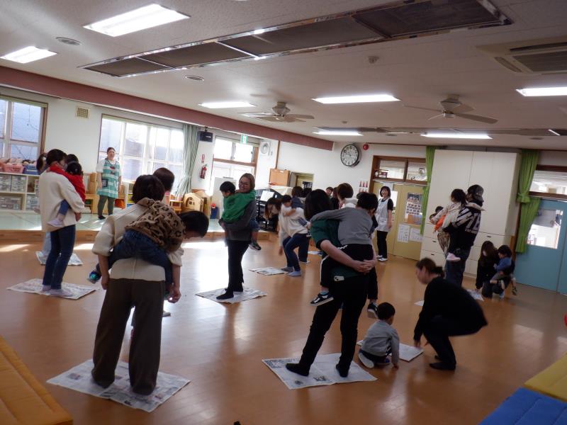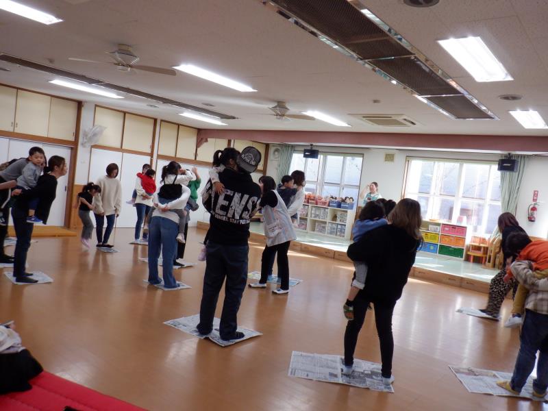 普段行っているリズム運動を観てもらった後に、親子で新聞紙ジャンケンのゲームをしました☆