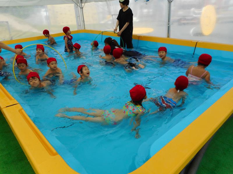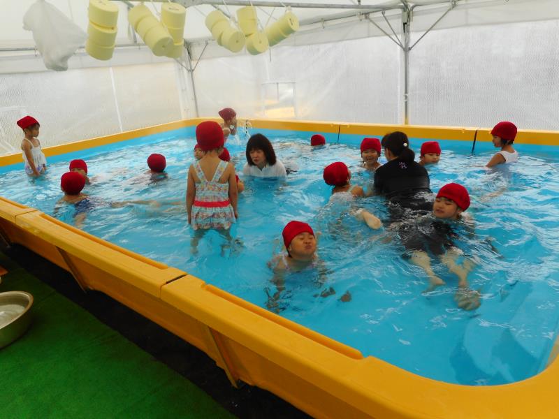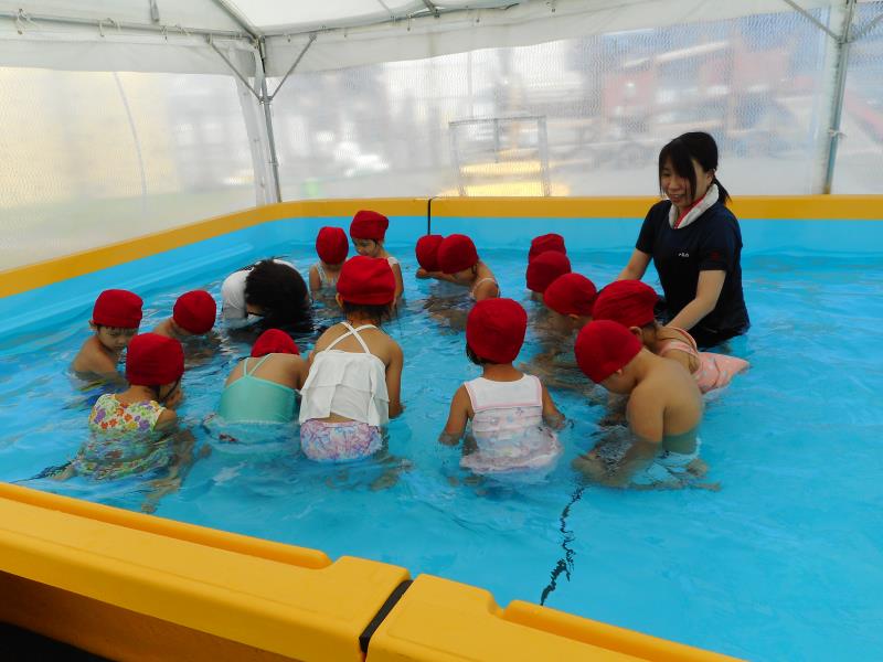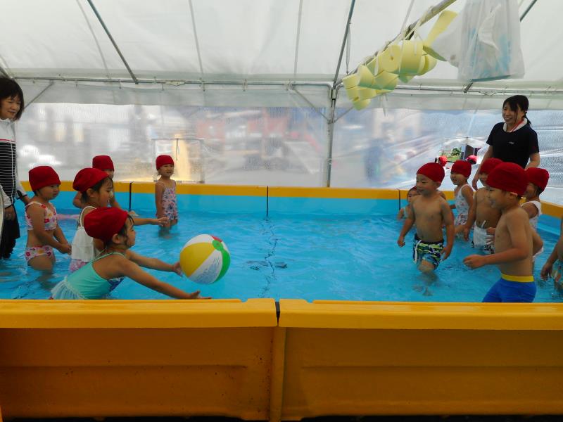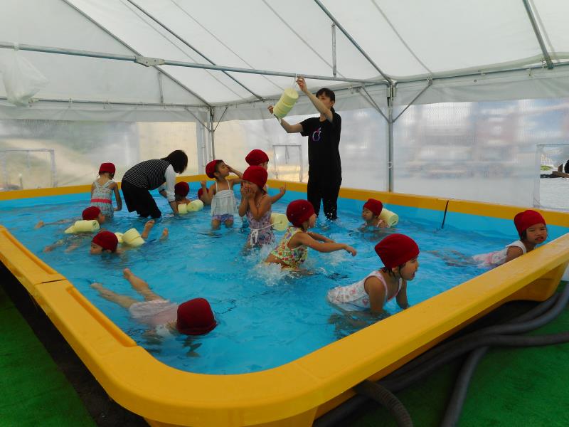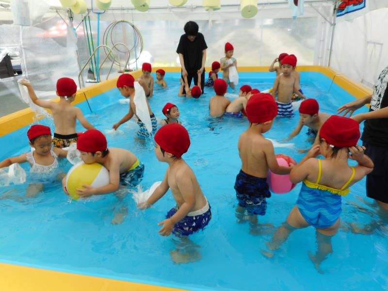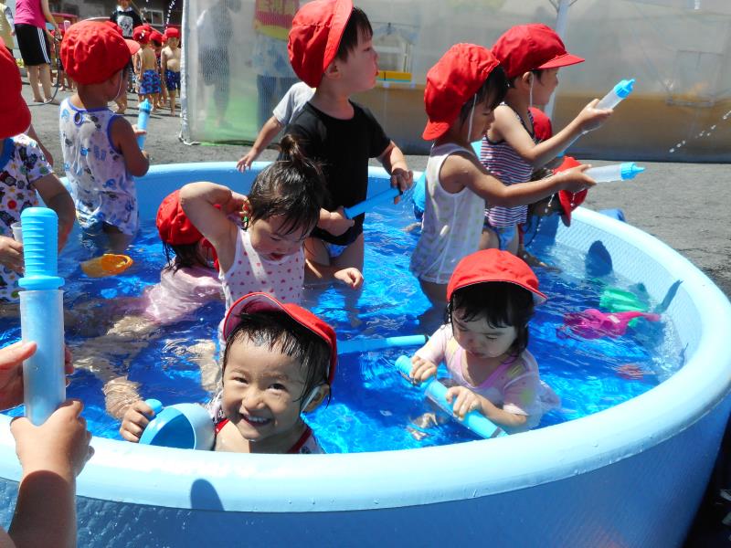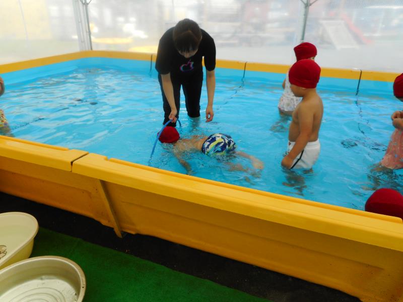 お友達と楽しく水にふれて遊び、全員が顔をつけられるようになったようですよ!