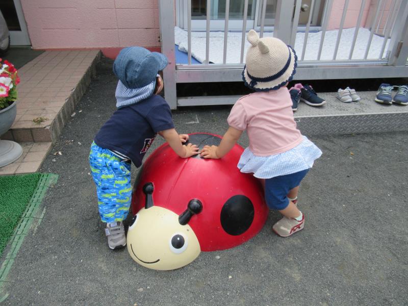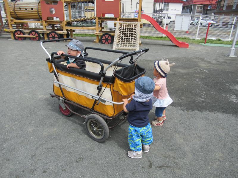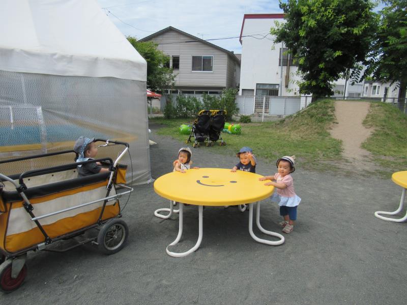 お友達の乗っているワゴンを押してあげたり、仲良くにこちゃんテーブルにつかまり立ちしてみたり、可愛らしい姿がみられましたよ。