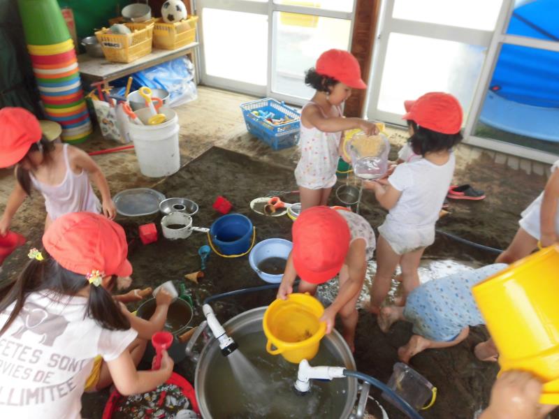 今日はすみれさん、お砂場ランドにで砂水遊びをしました。