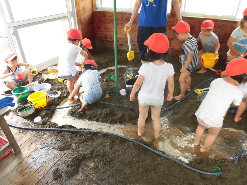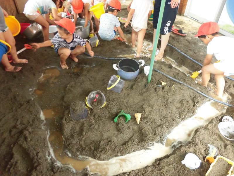 スコップで道を作って、みんなで「いっせーのーで!」と水を流したり、足を入れて「つめたーい!」「気持ちいい~!」と砂水の感触を楽しみましたよ!