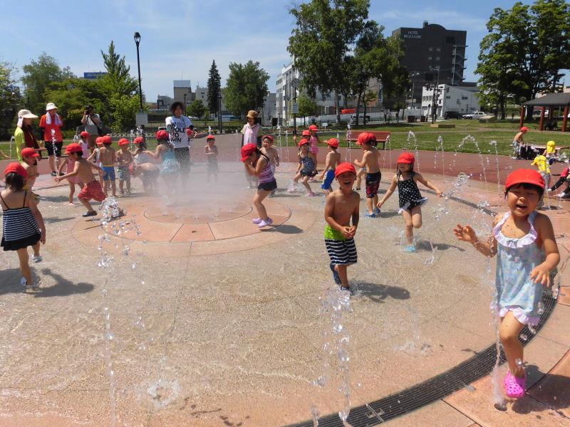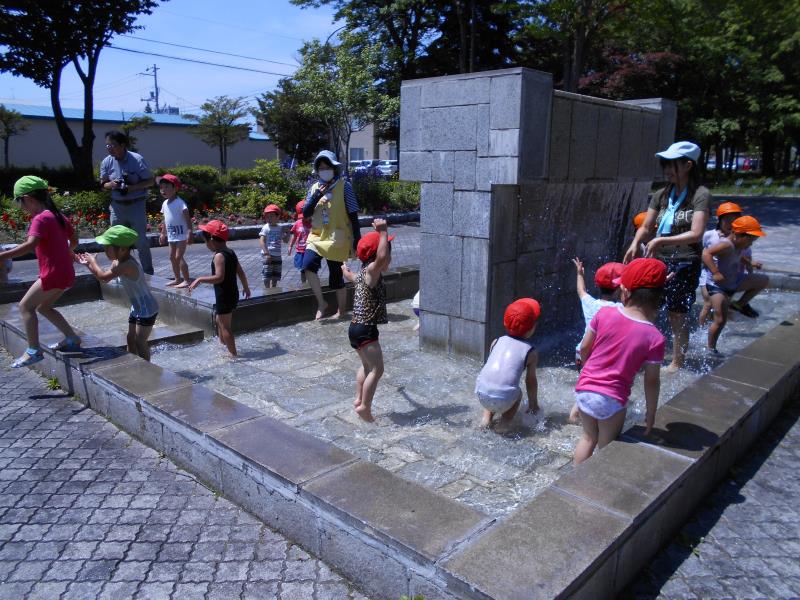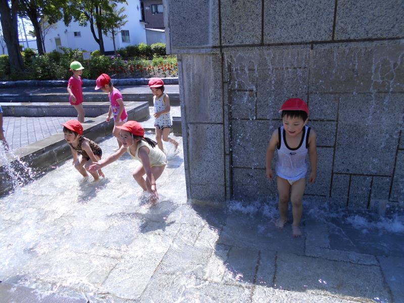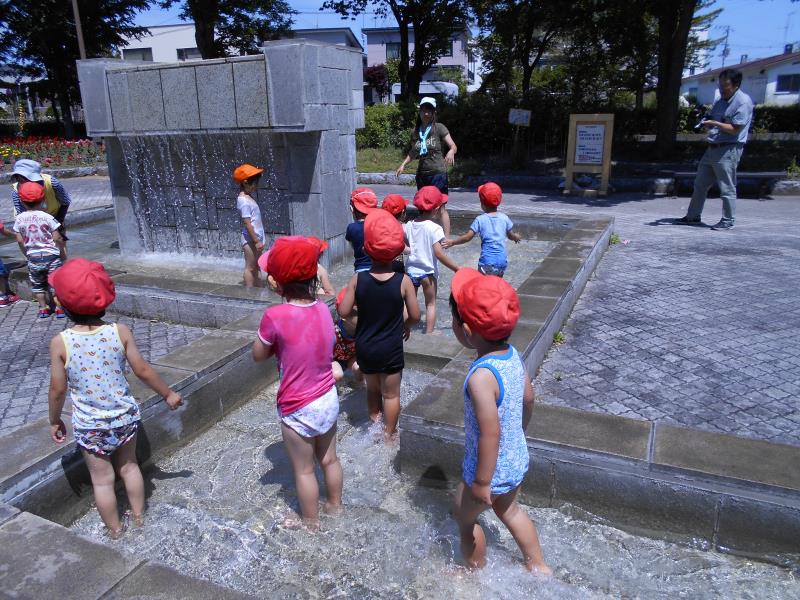 今日の園外保育はお散歩の予定を変更して、お水遊びをしました!