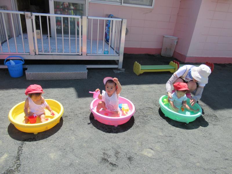 未満児さんは園庭でお水にふれて遊びましたよ。