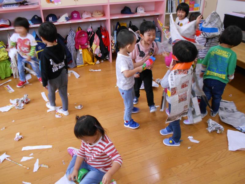 自分で紙をクルクル巻いて棒を作り、丸めてボールも作って野球ごっこも始まったようです!
