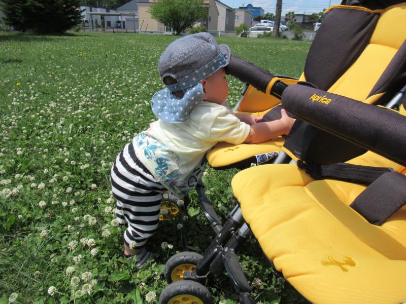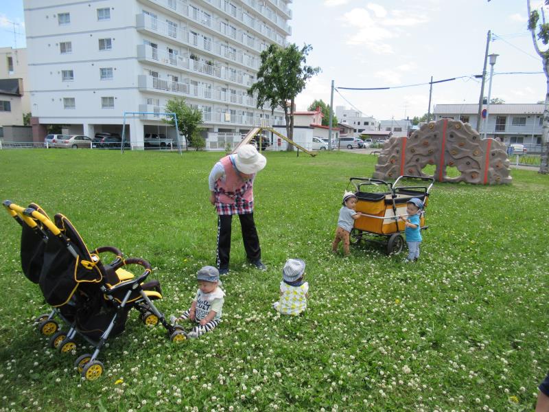 ももさんは、芝生の上に座ってお花をさわったりして、気持ち良く過ごしていましたよ。