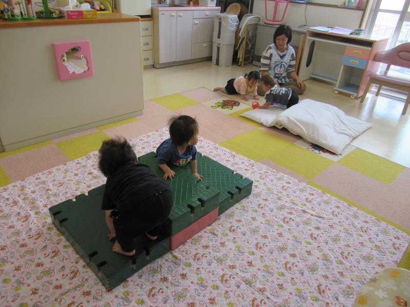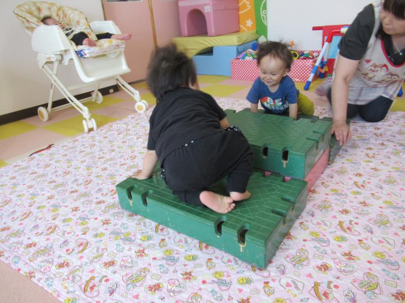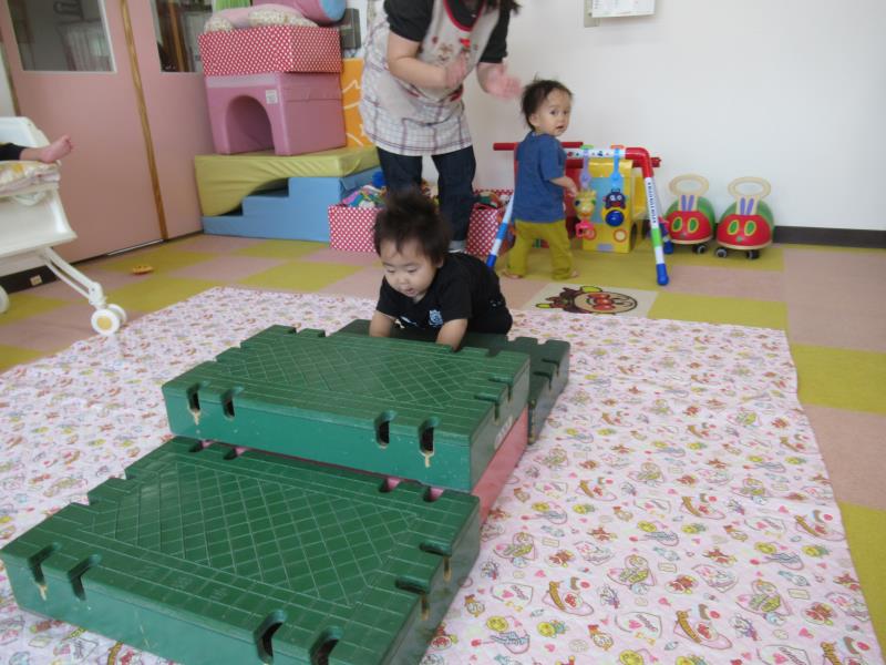 ももさん、今日はお部屋で巧技台にのぼって下りたりと体を動かして遊びましたよ!