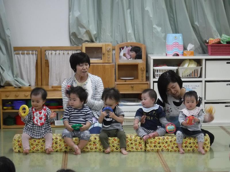 ももさんは、お名前呼びと・チューリップの歌・音の鳴るおもちゃをみんなで鳴らしました。