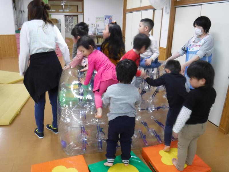 お友達の人数が少なかった今日は、3・4・5歳児が集まってお遊戯室で遊びました。
