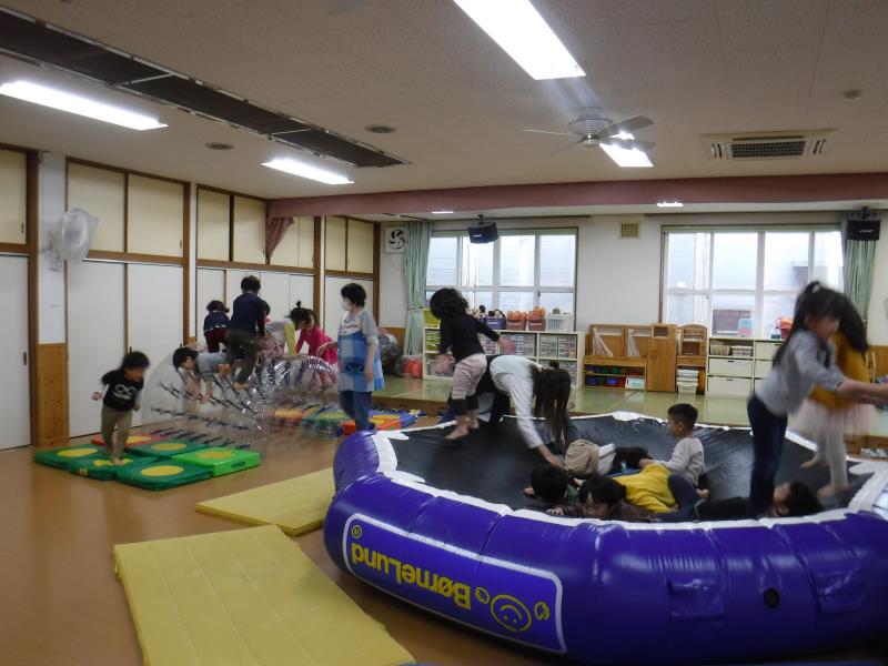トランポリンで思い切り跳ねたり、トンネルによじ登ったりと、体を動かして遊びました~♪