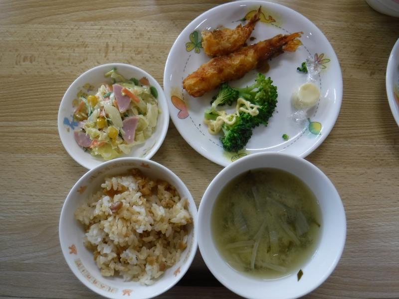 今日の献立は、「竹の子ごはん」「エビフライ」「ブロッコリー」「チーズ」「コールスローサラダ」「わかめと玉ねぎのみそ汁」「オレンジ」でした。