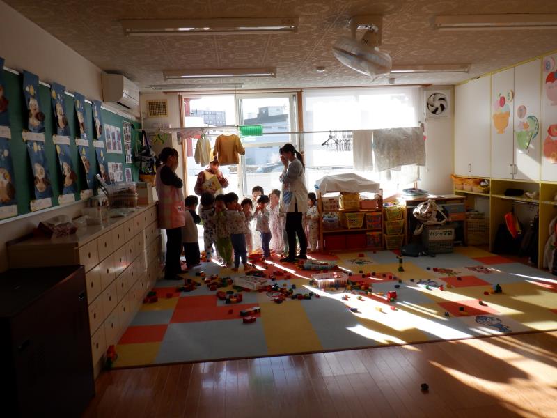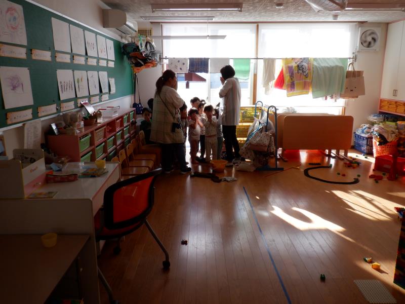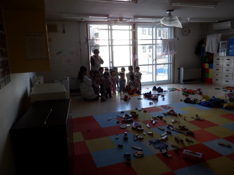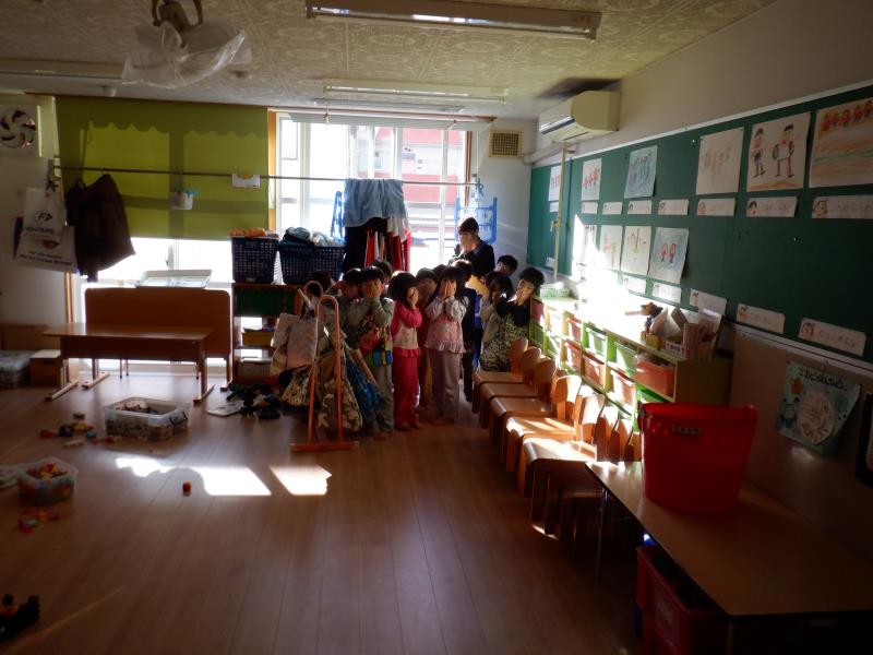 急にサイレンが鳴ってビックリしたお友達もいましたが、先生の誘導のもと、無事にベランダ前に避難できましたよ。