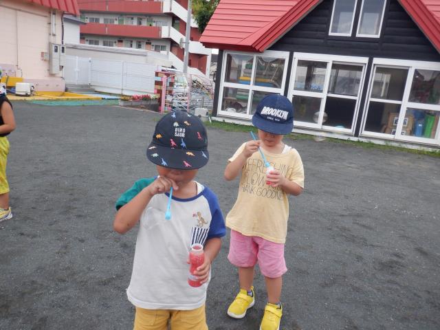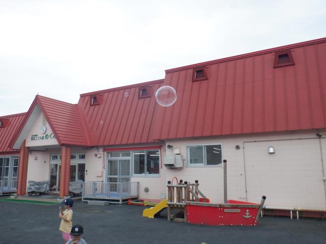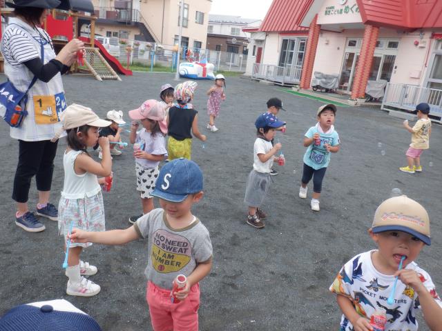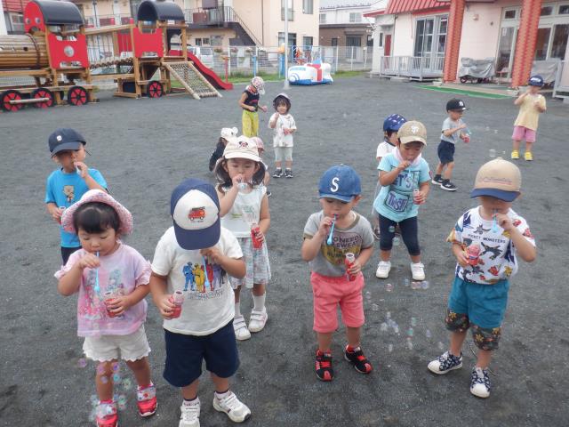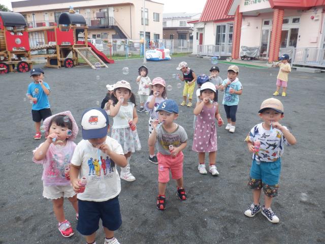 ふう~って吹いたら 大きなシャボン玉ができたよ。