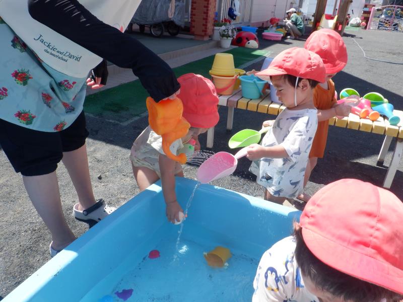 たらいに入ったお水、触ったら気持ちいいね。