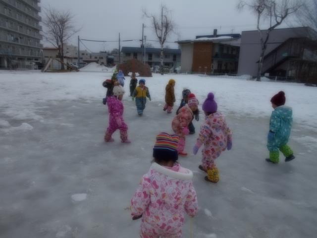 あんなにたくさんの雪があった公園も、雪解けしていてスケートリンクのようになっていました。