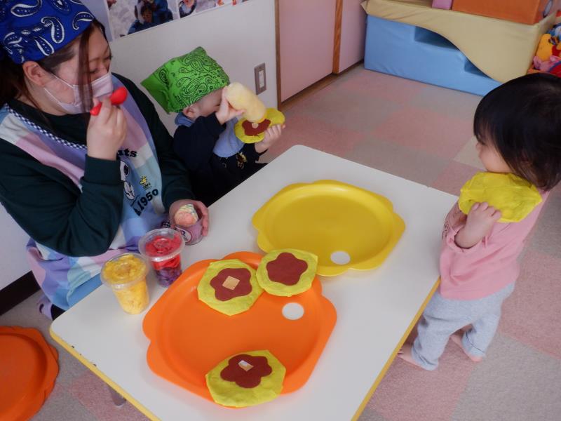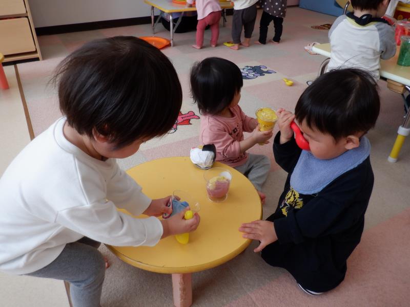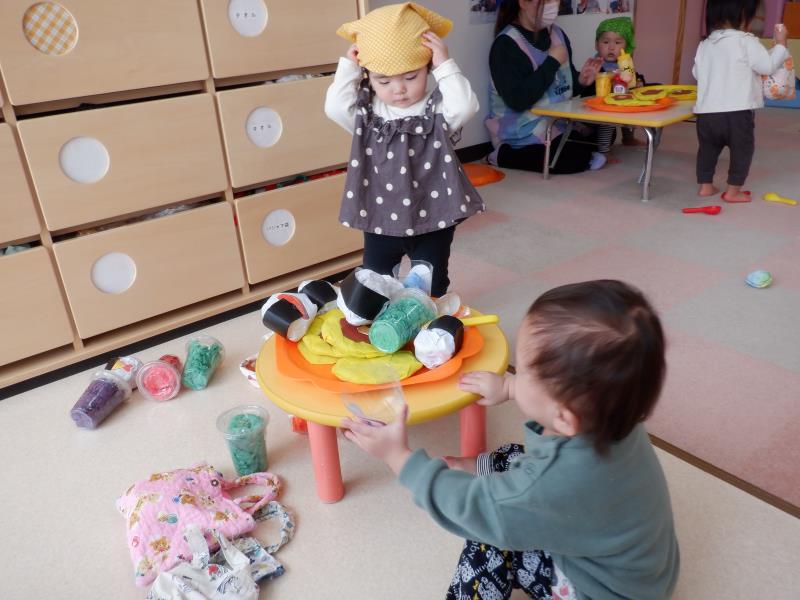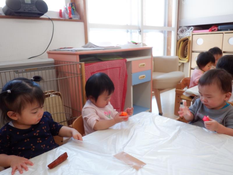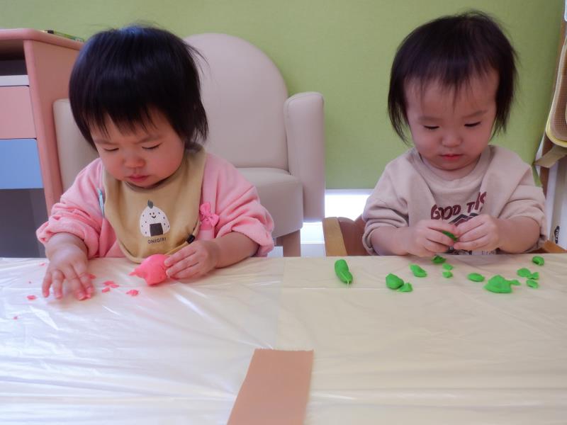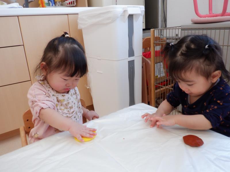 初めはビックリして手をお膝にしてしまう子もいましたが、慣れてくると自分からふれたり、潰したり、ちぎったりして感触を楽しんでいましたよ♪