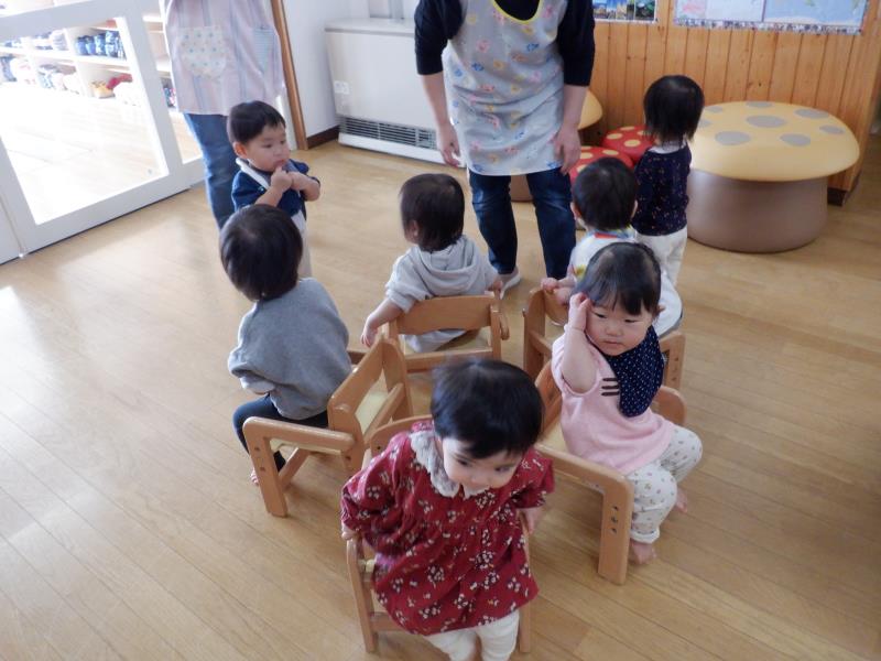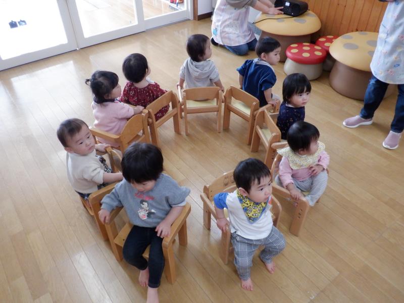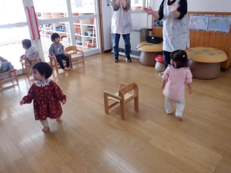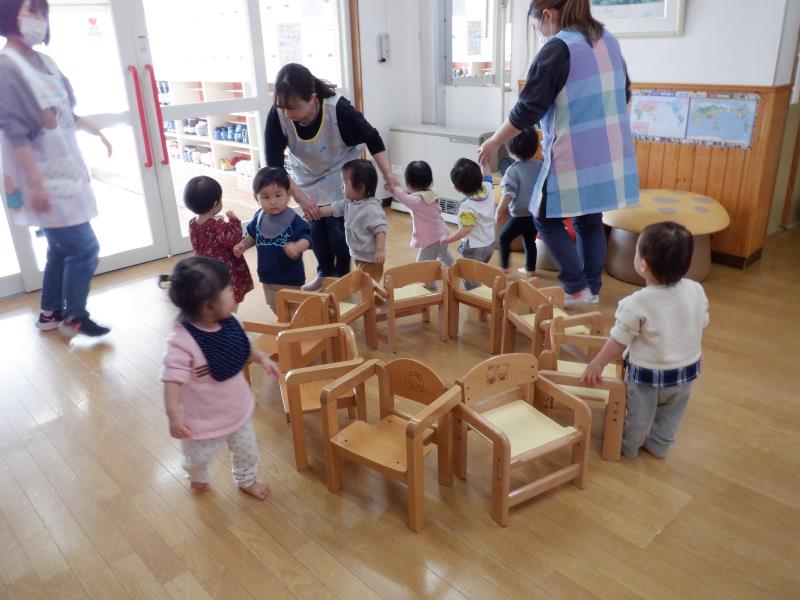 さんぽ♪の曲と共に、イスの周りを歩いて、曲が止まると座る場所を探します。