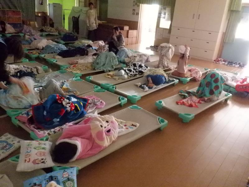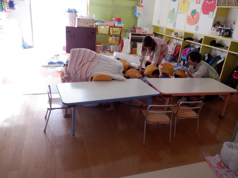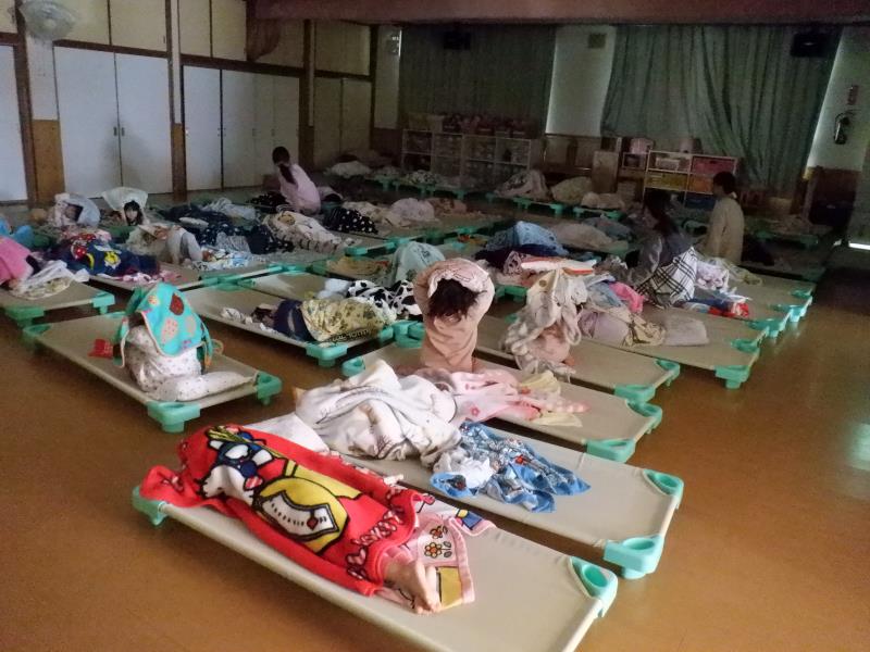 お部屋のベランダへ、防災頭巾を被って避難しています。
