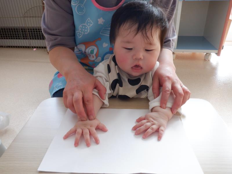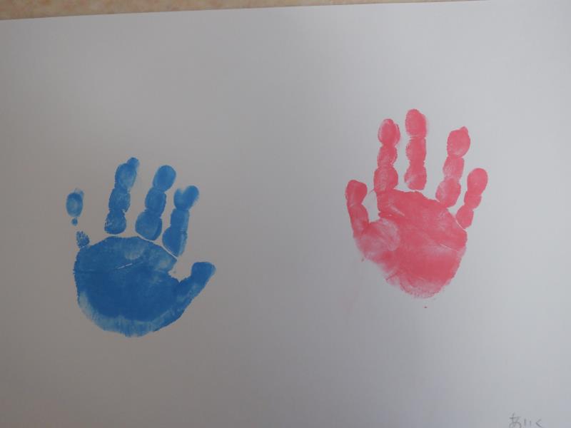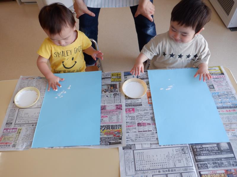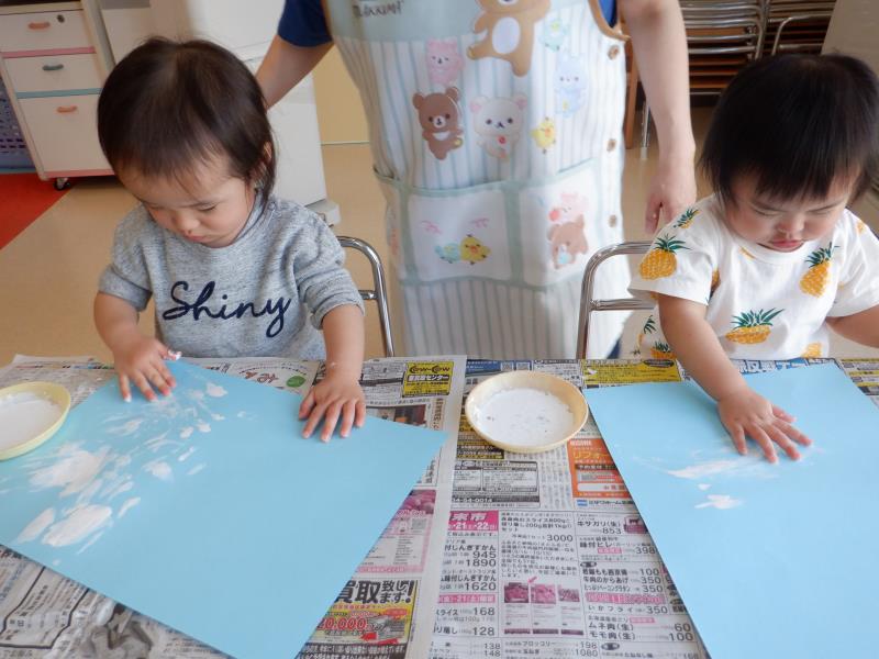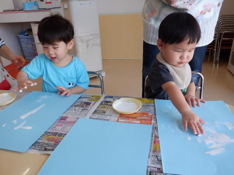 水色の画用紙に、白い絵の具を手でぺたぺた。