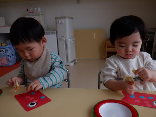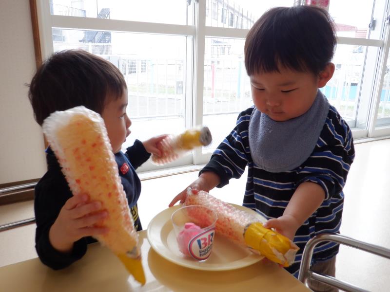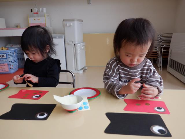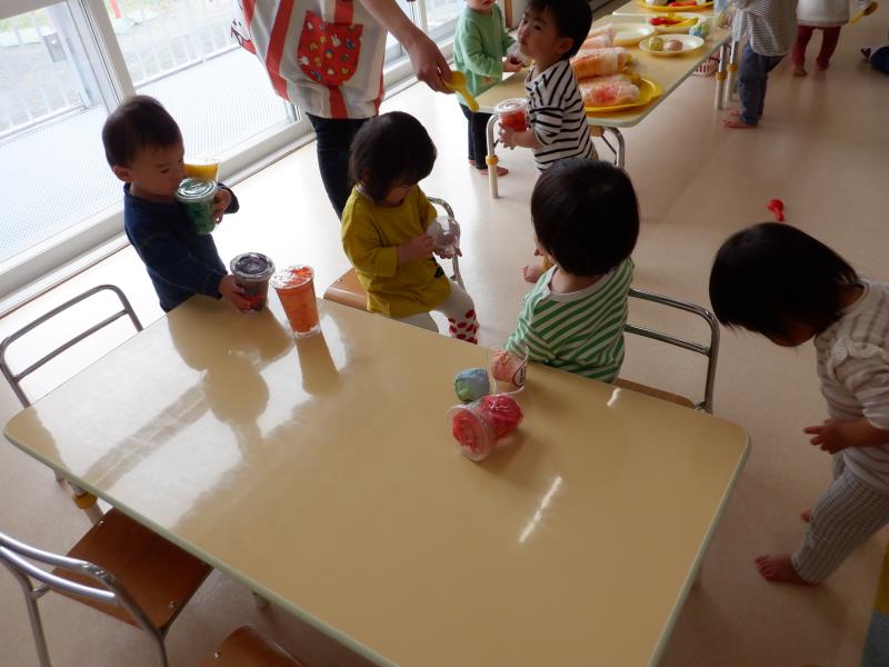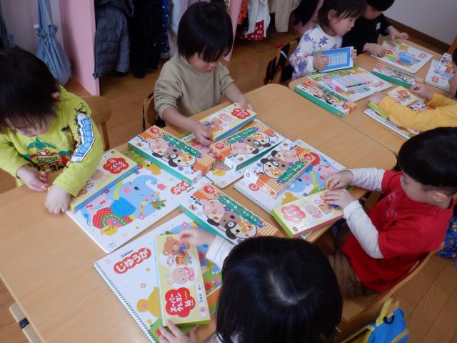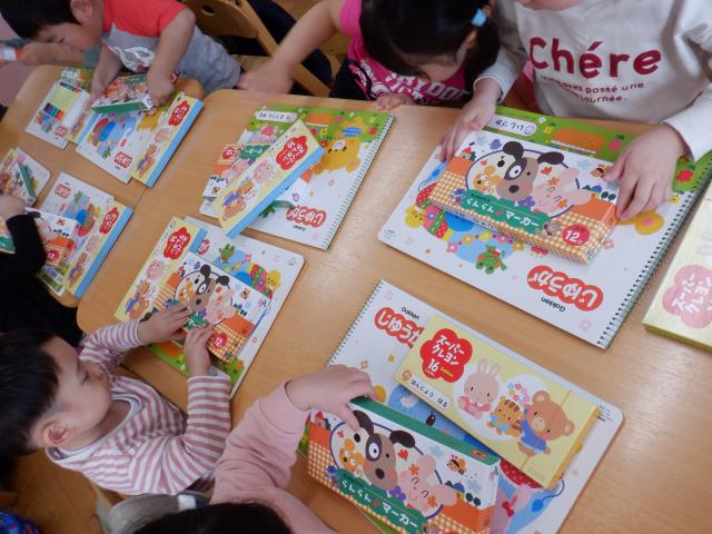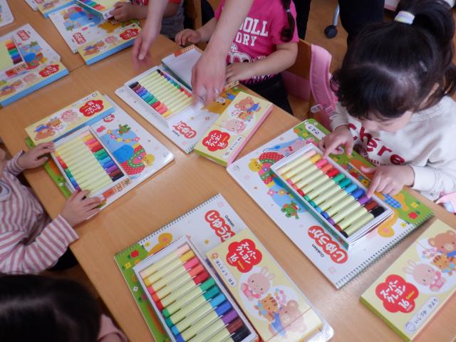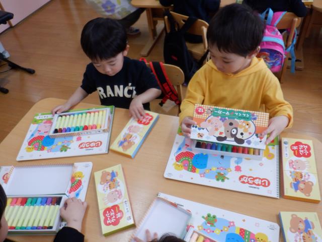 箱を空けて新しいクレヨンやマーカーを見て 何色が好き?などとお話したり 自由画帳の使い方も確認!! 自分のお道具箱に上手にお片付けもできました。
