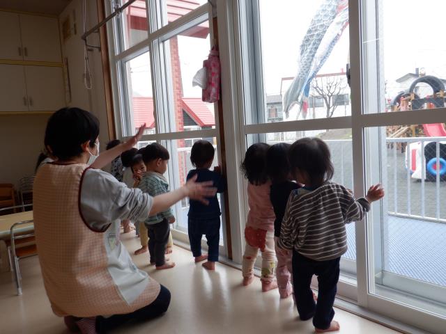 お庭のこいのぼりに興味深々のちゅうりっぷさん。