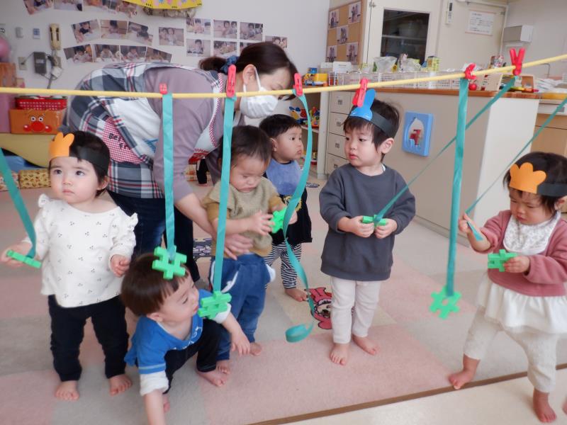 ひなまつりって何だろう?どうしてひな人形を飾るのかな?というお話を聞いてから、みんなでドーナツ取りゲーム!!