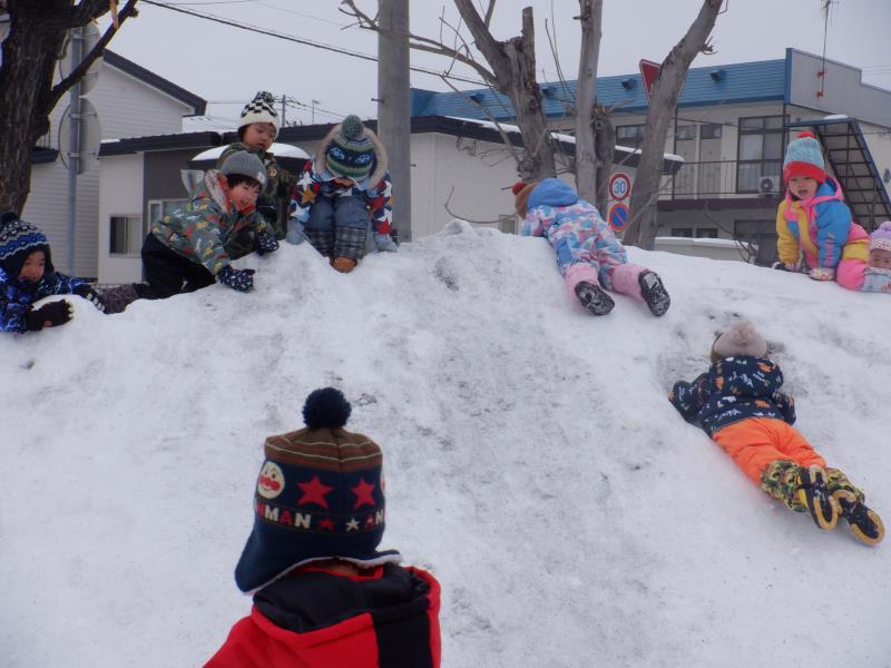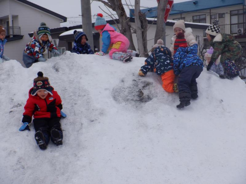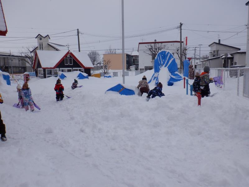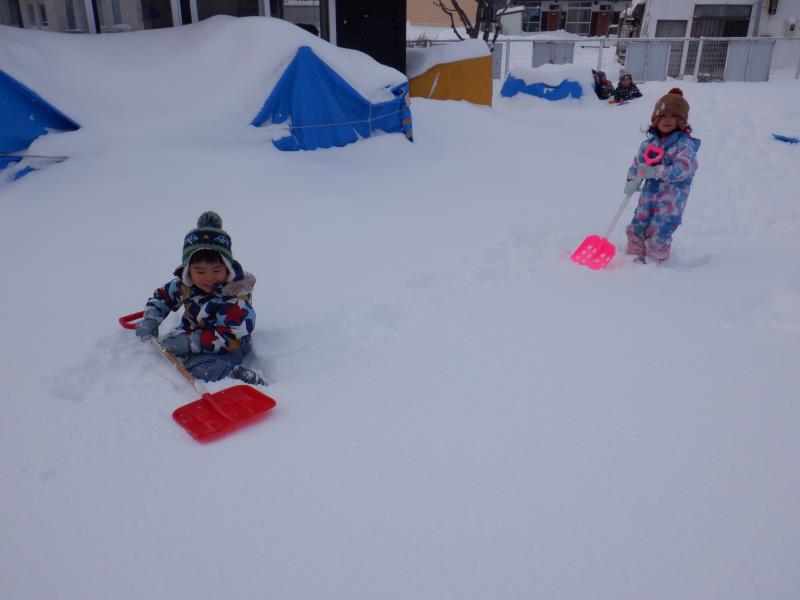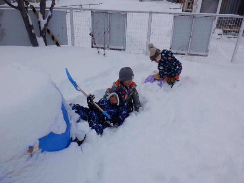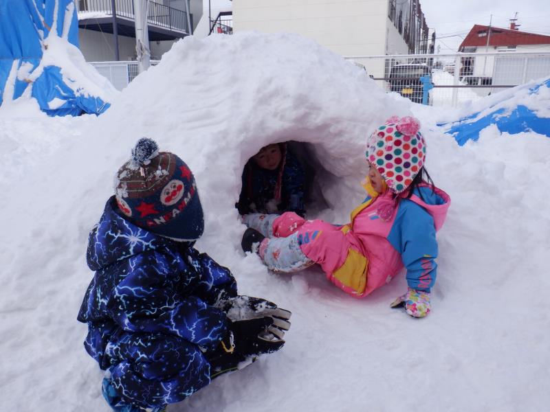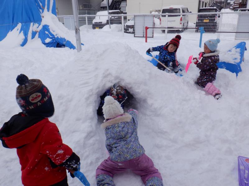 小さいスコップを持って、ヨイショヨイショと雪を集めます。みんなで作ったかまくらの完成♬玄関前にあるので、見てみて下さいね☺