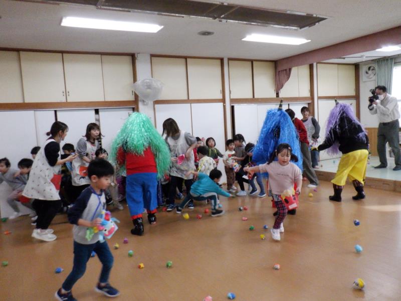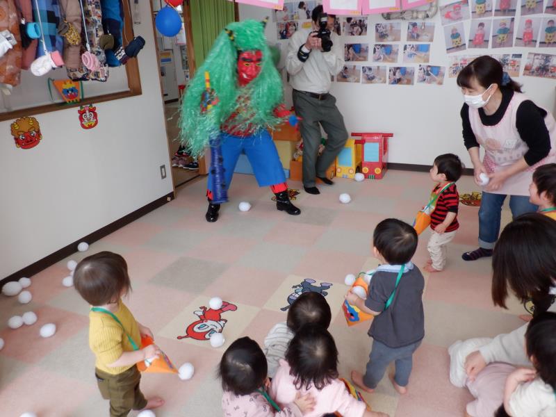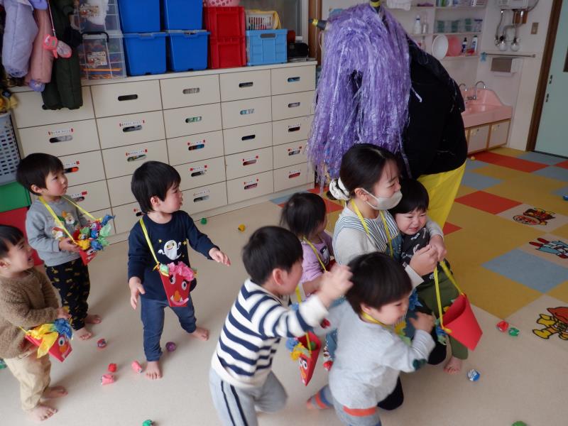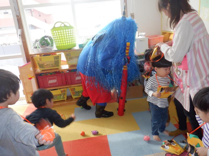 ここ数日、めぐみではチラホラ鬼が登場し、豆まきごっこが盛んでしたが、今日はいつもよりこわ~~い鬼がやってきましたよ。