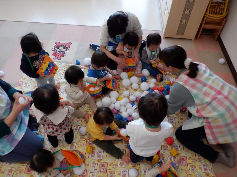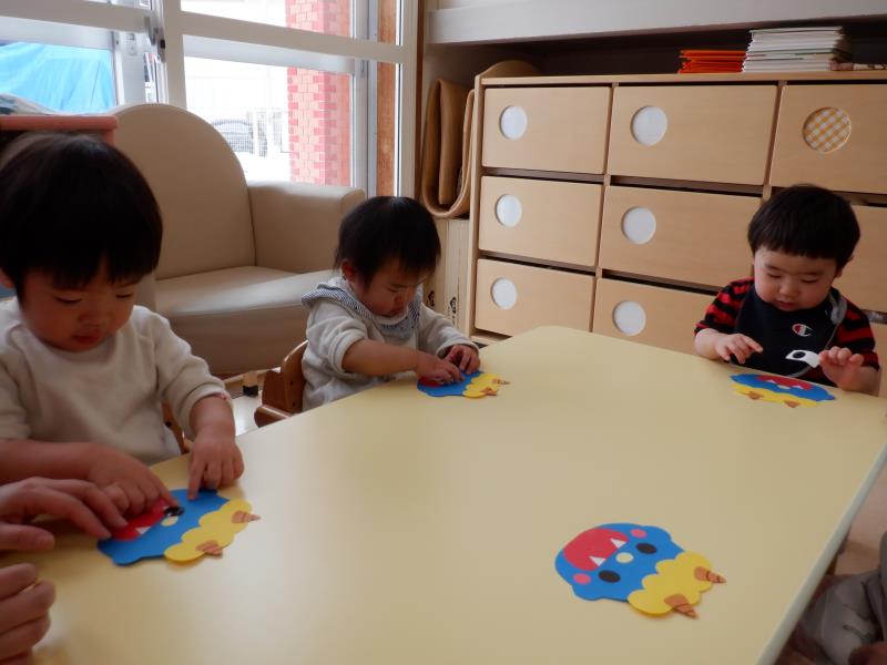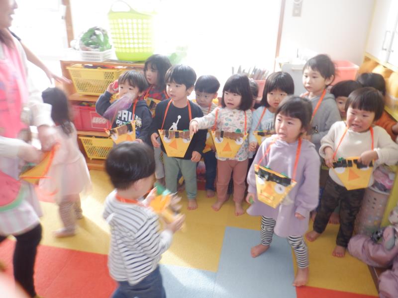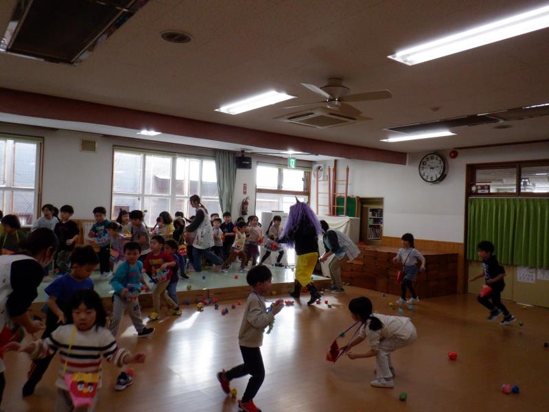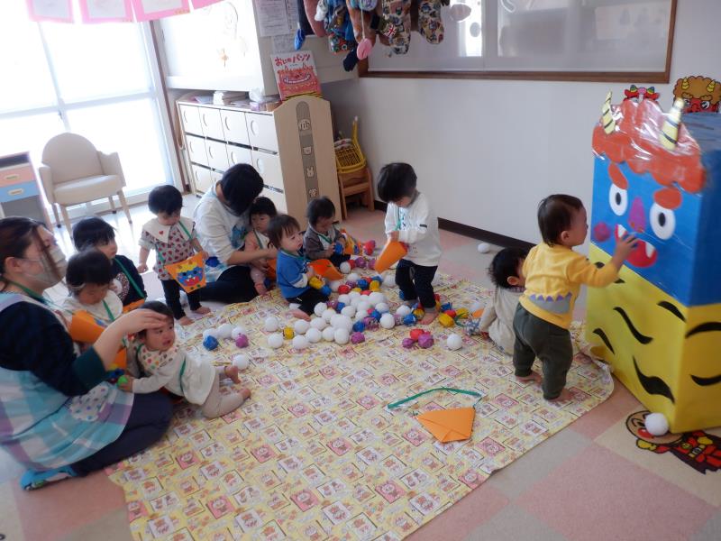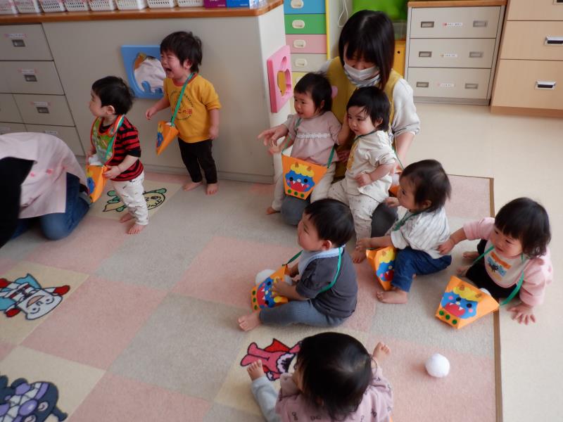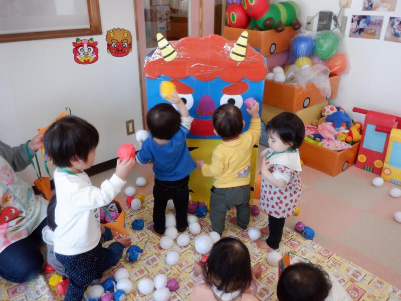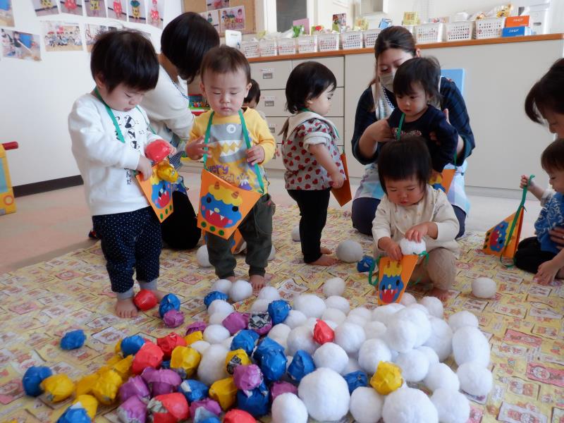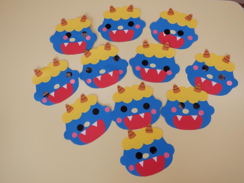 どうして豆まきをするのかな?というお話を聞きながらも、内心はビクビク。自分の中にいる悪い鬼も退治しよう!!と、元気に豆まきの歌をうたい、作戦会議もしました。