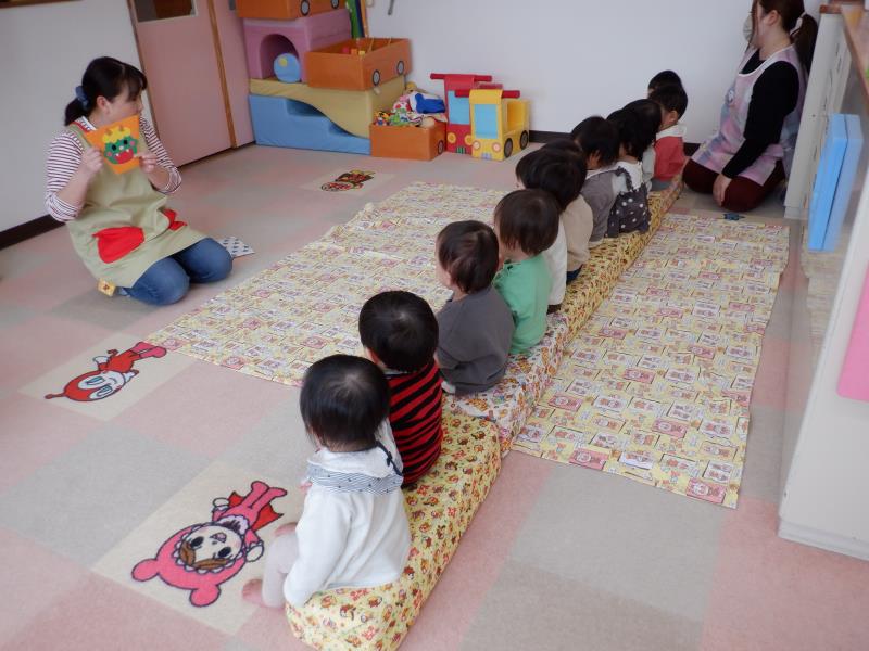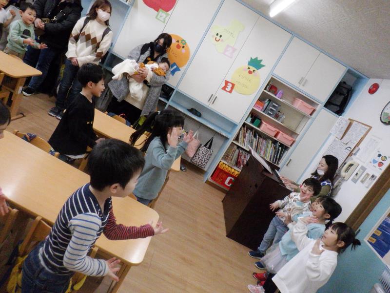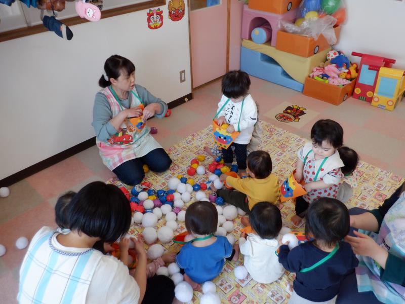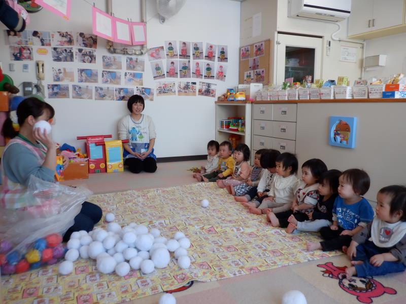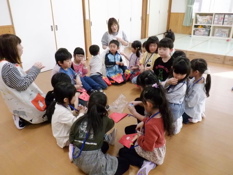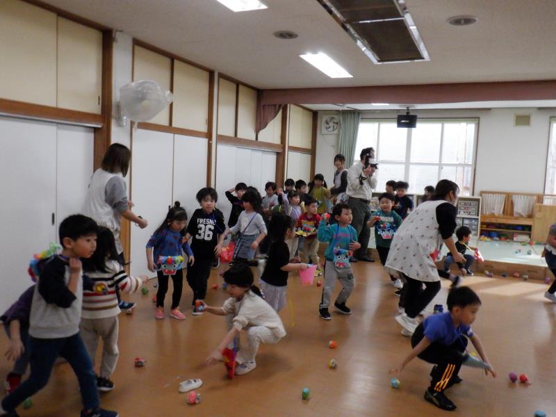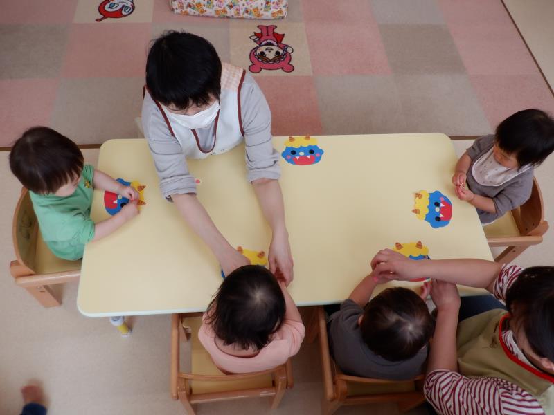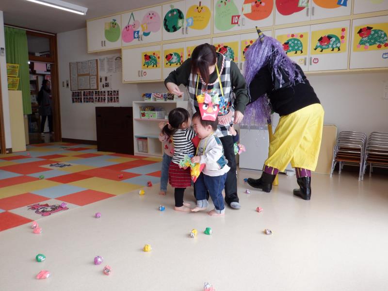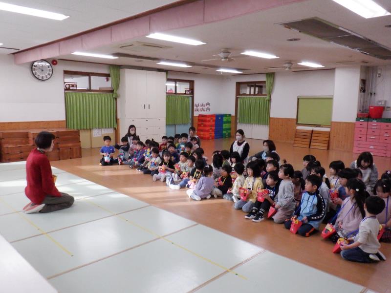 どうして豆まきをするのかな?というお話を聞きながらも、内心はビクビク。自分の中にいる悪い鬼も退治しよう!!と、元気に豆まきの歌をうたい、作戦会議もしました。