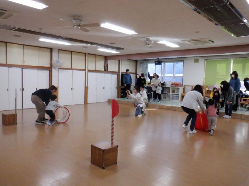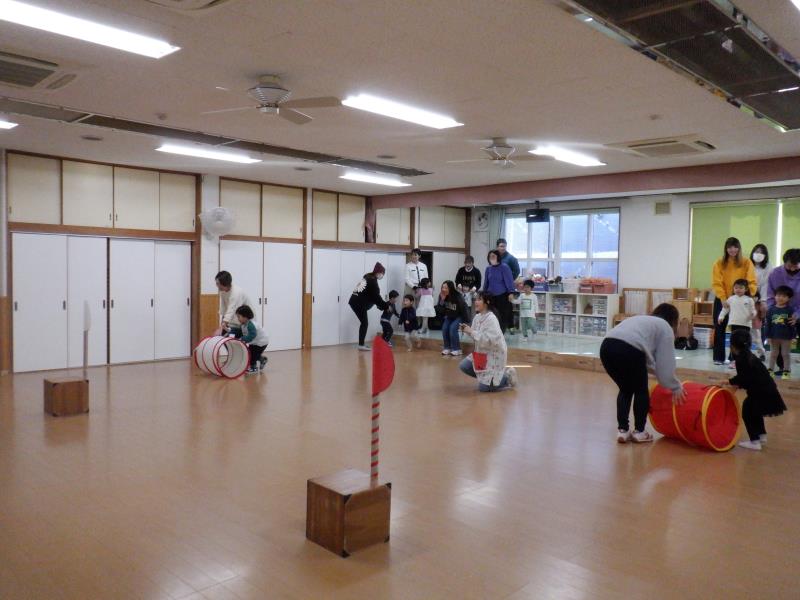 「親子でトンネル転がしゲーム」では、お父さんやお母さんと一緒に転がすことが嬉しそうなさくらさん♪盛り上がりをみせていました☺