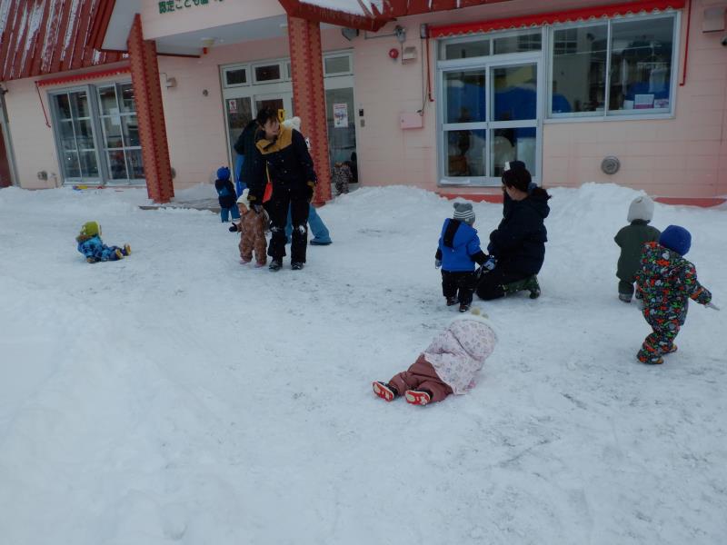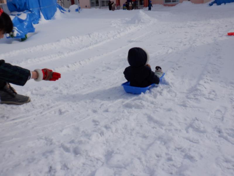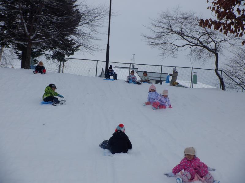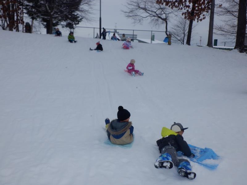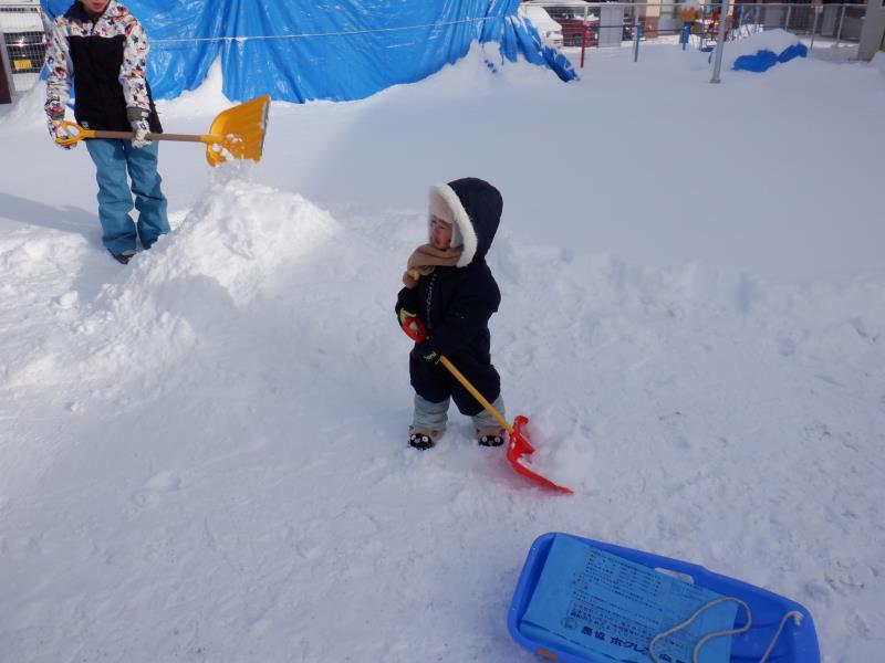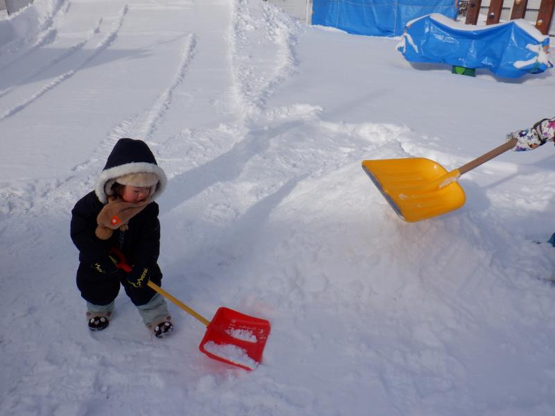 スコップを使って雪かきをしたり、そりすべりをして遊んでいますよ。