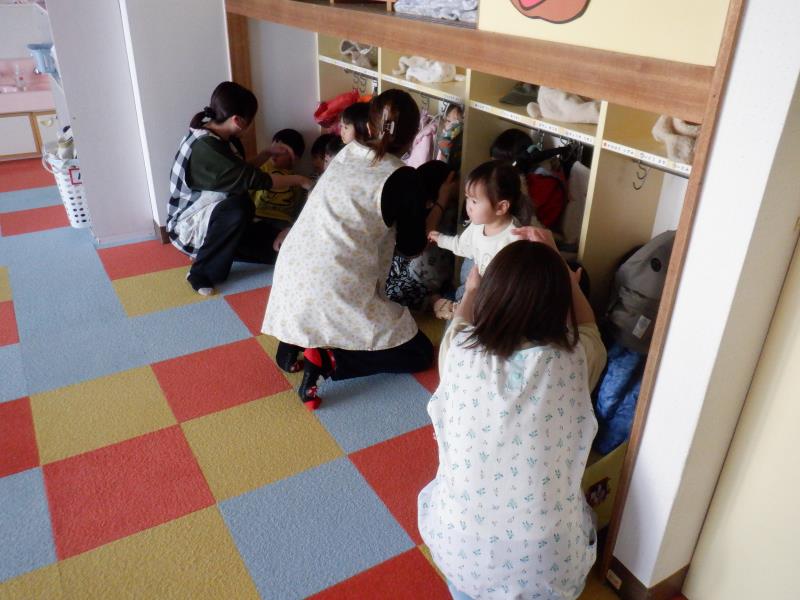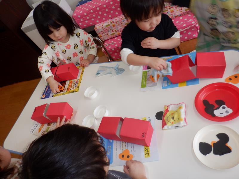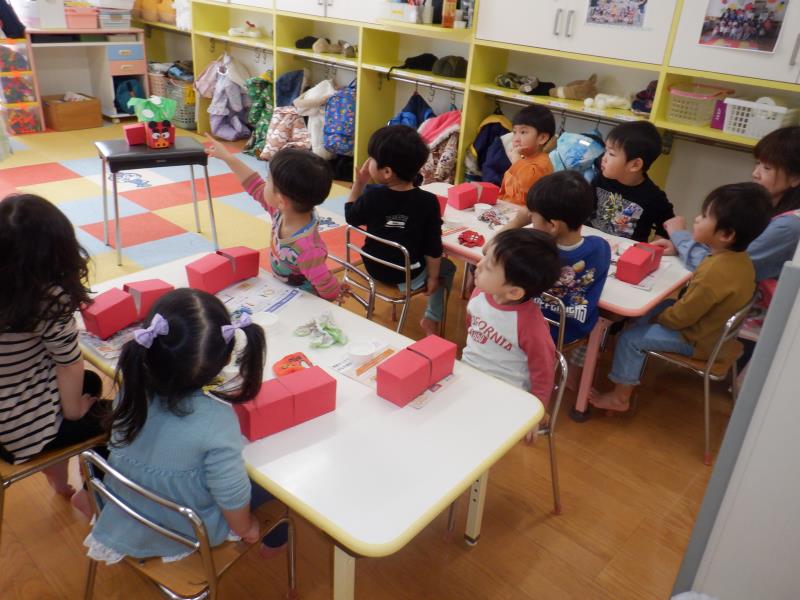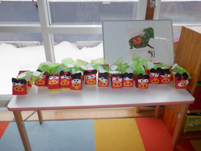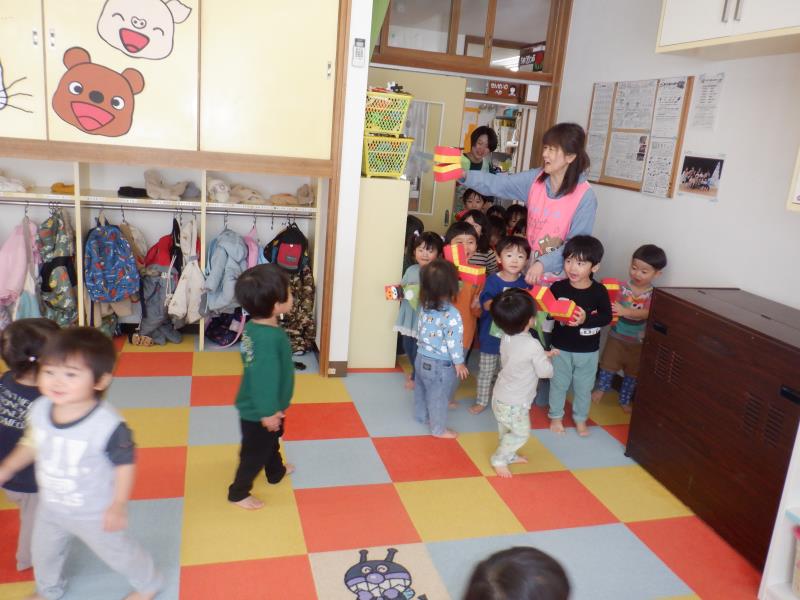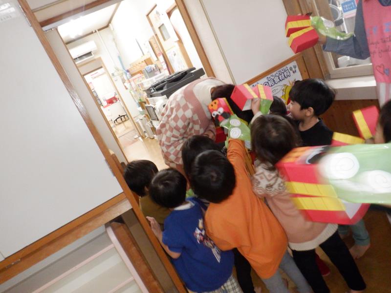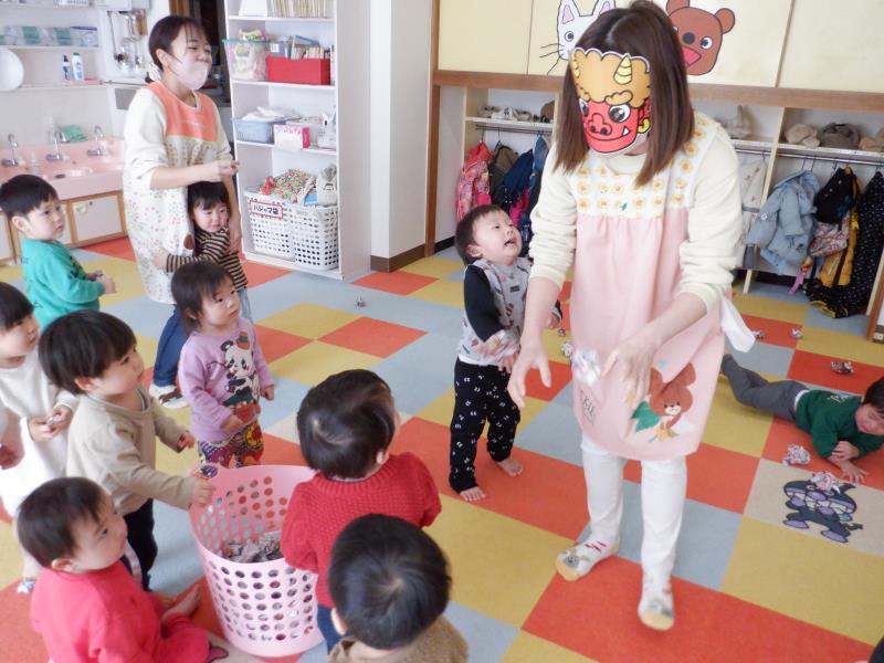 そのあとは、豆まきごっこ!頑張って「鬼は外~!福は内~!」と豆まきしましたよ☺