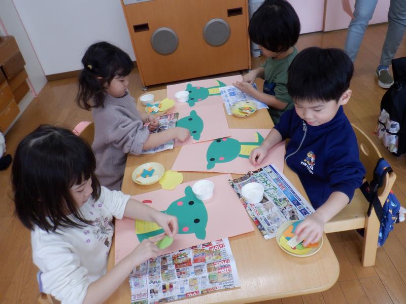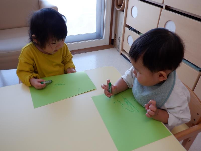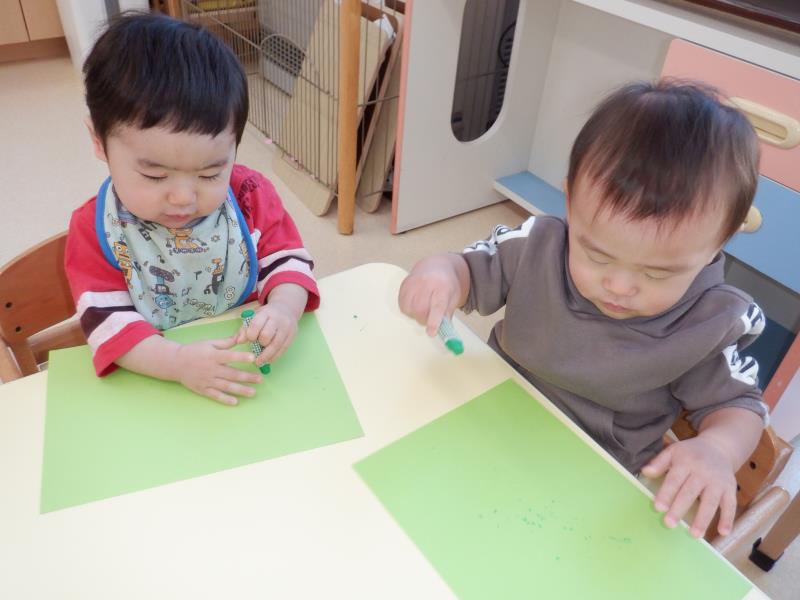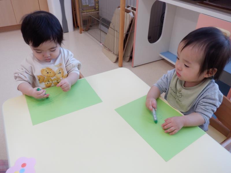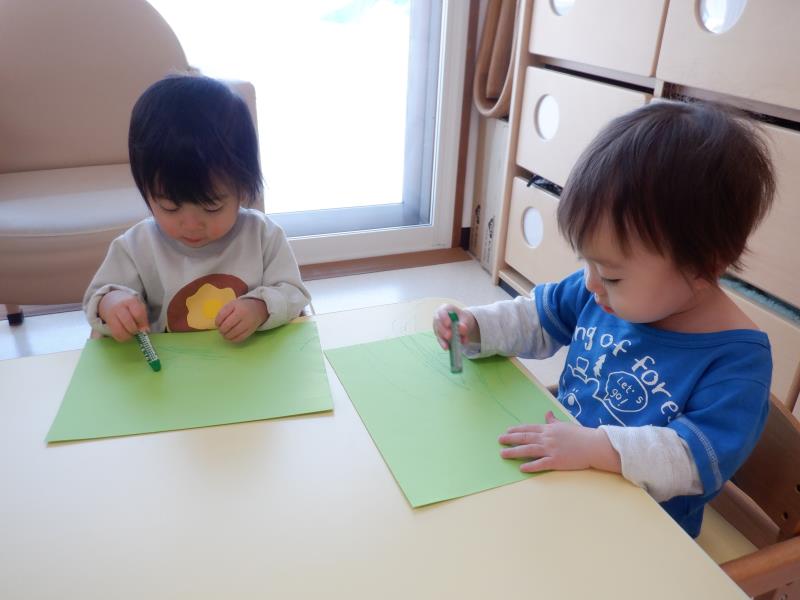 クレヨンを握って、上下左右に描き描き・シールぺたぺた製作に挑戦!絵馬になるようですよ~☺