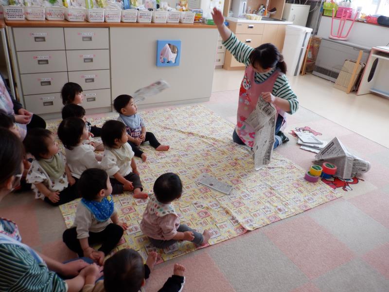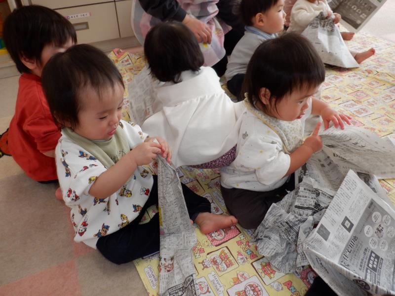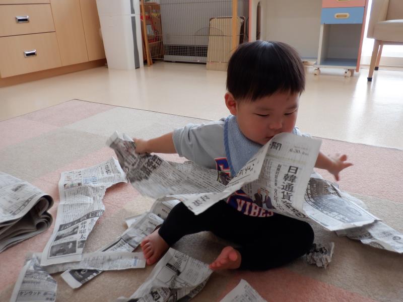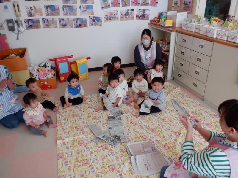 ももさんは、お部屋で新聞紙遊びをしましたよ。