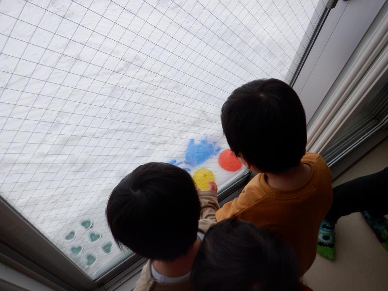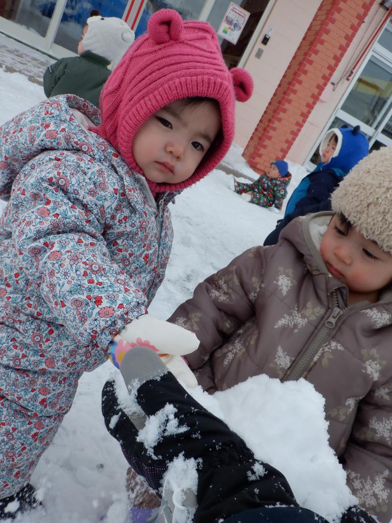 先生が手に雪をこんもり乗せると、上からさわって落ちていく雪に大喜び♪
