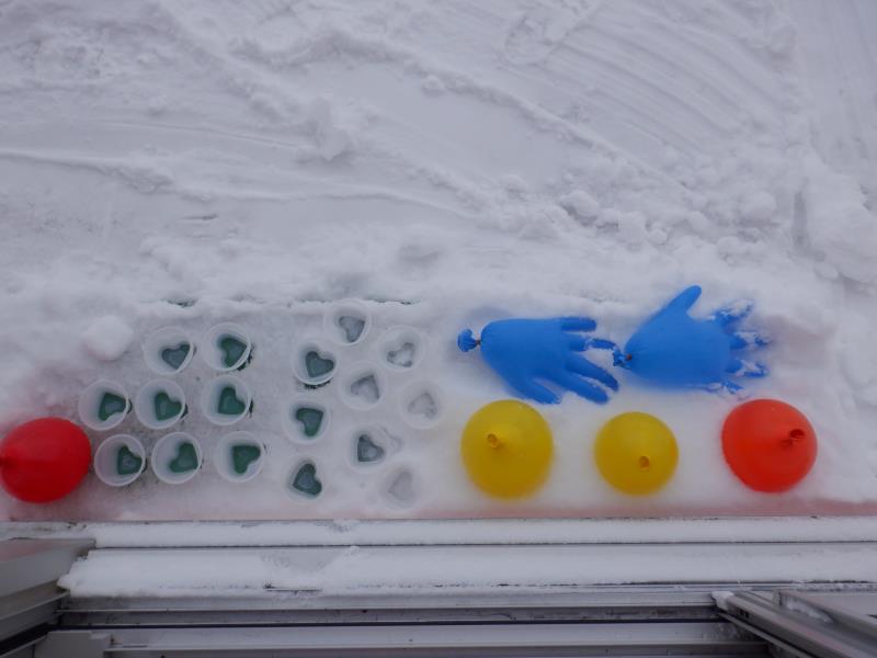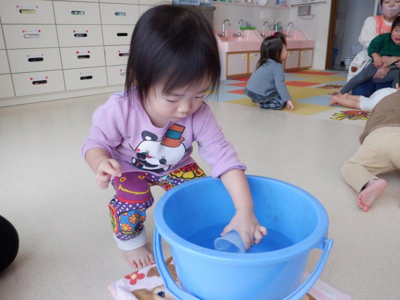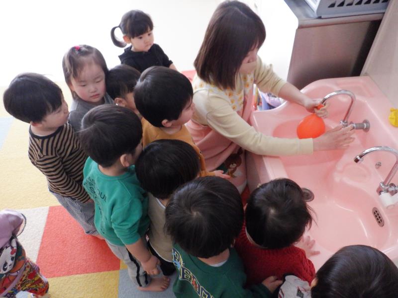 一人ずつカップにお水を汲んで、氷作りに挑戦!