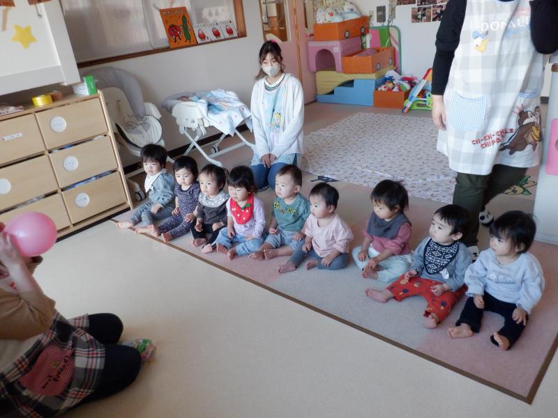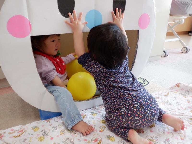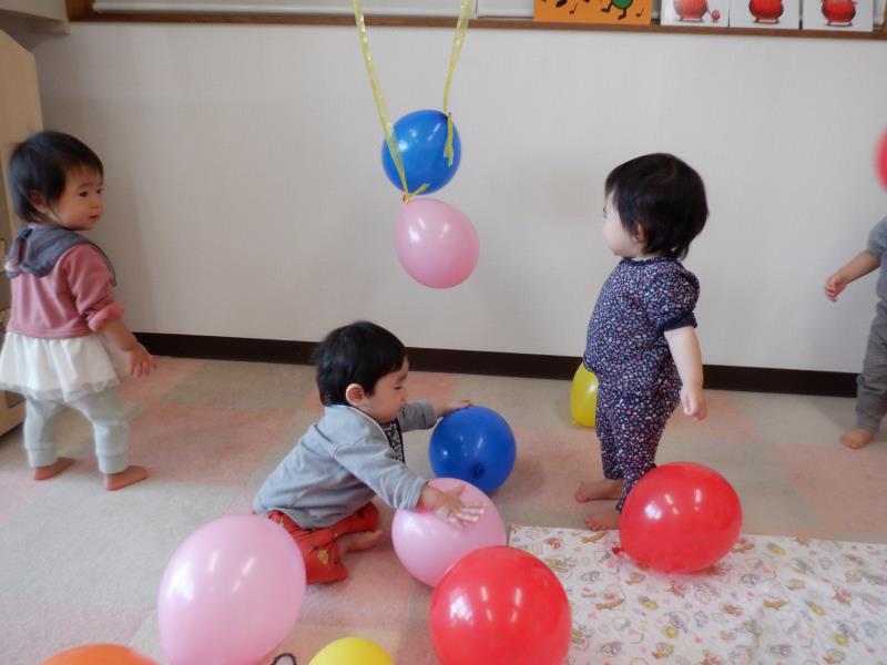 スズランテープで上から風船を下げると、ポンポンさわって楽しそう☺