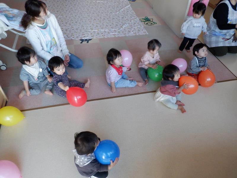 風船を手に持ってフリフリ♪にぎにぎ♪