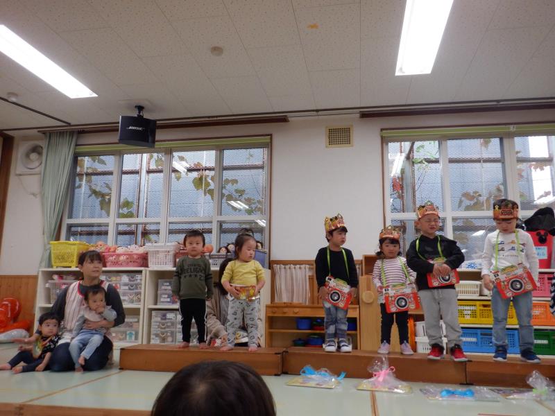 お休みのお友達もいましたが、先月出られなかったお友達もステージに上がり、8名のお友達をお祝いしましたよ。