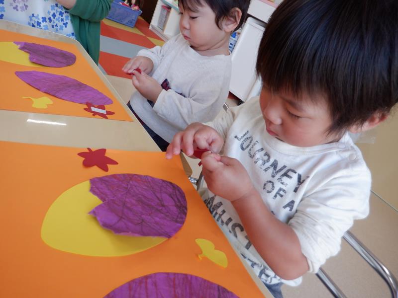 やきいもの皮をむいて、まわりに落ち葉をペタッ!