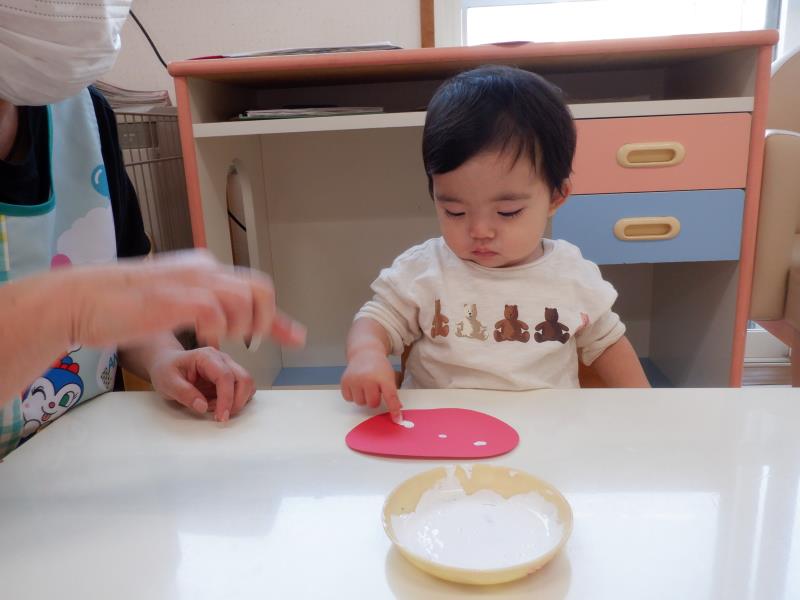 指絵の具で、きのこの模様をポンポン!