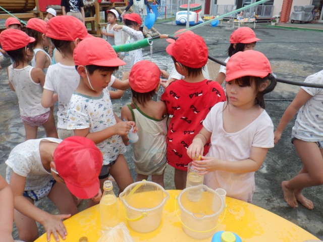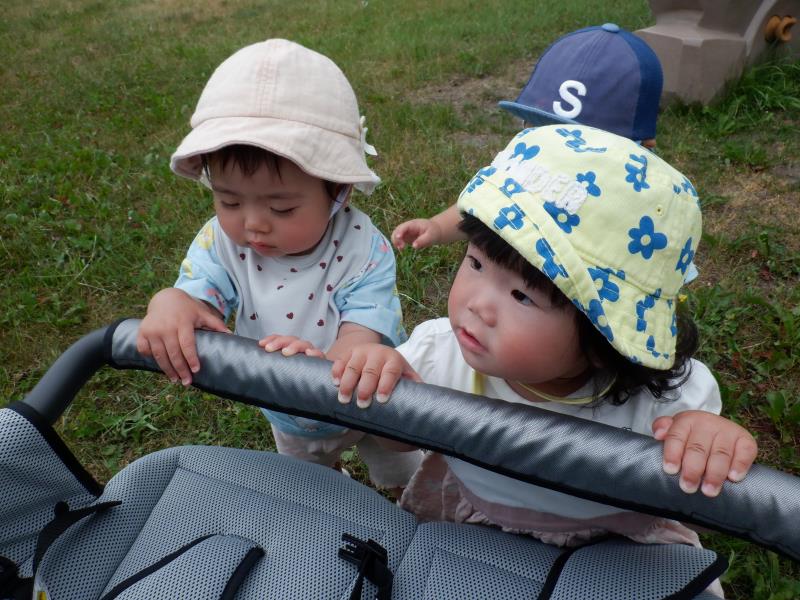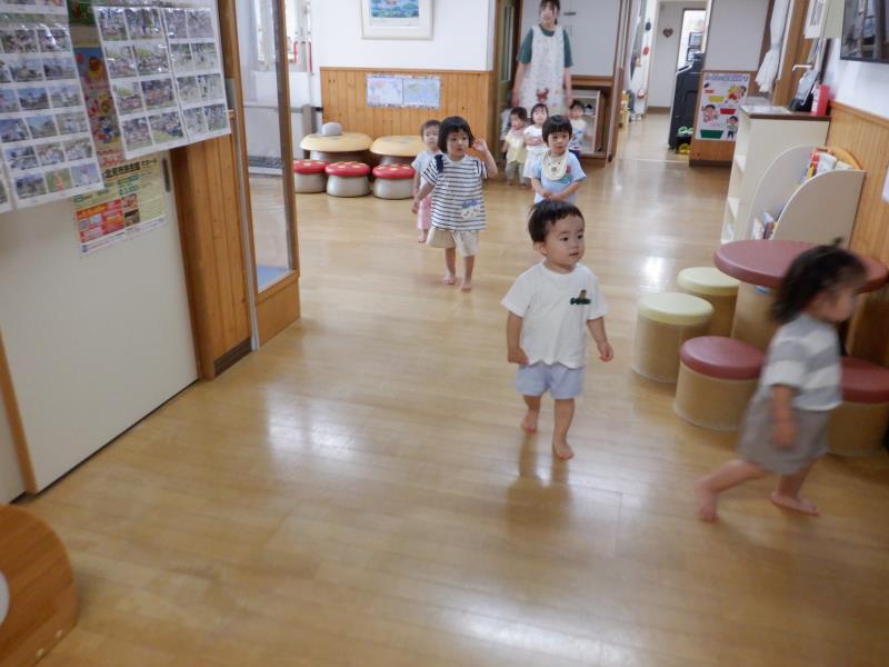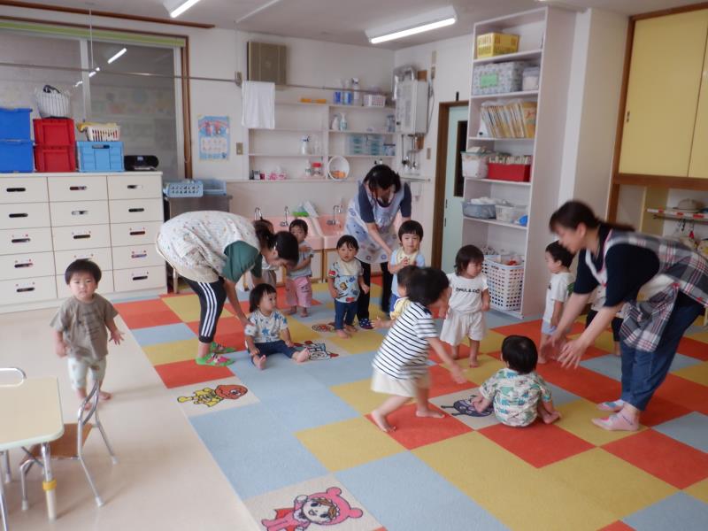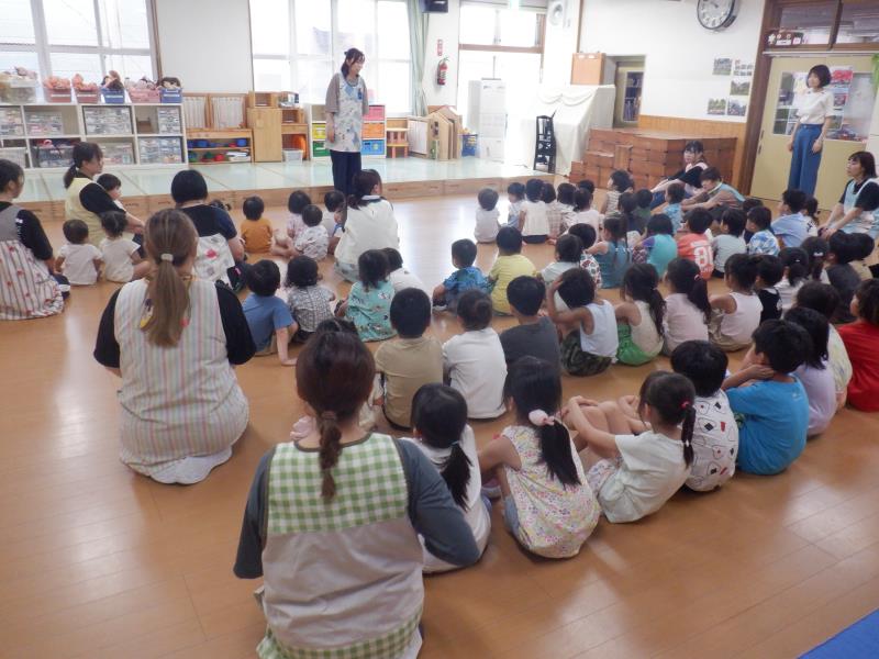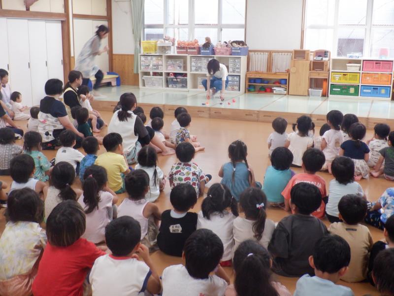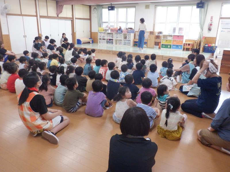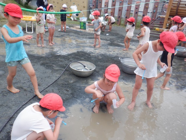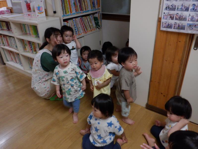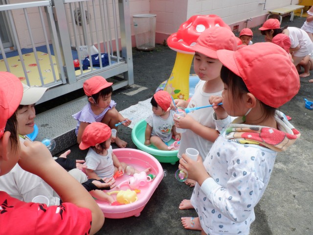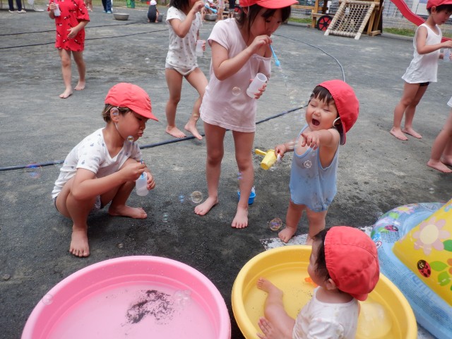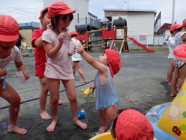 ゆりぐみさんがシャボン玉を見せにきてくれたよ