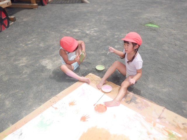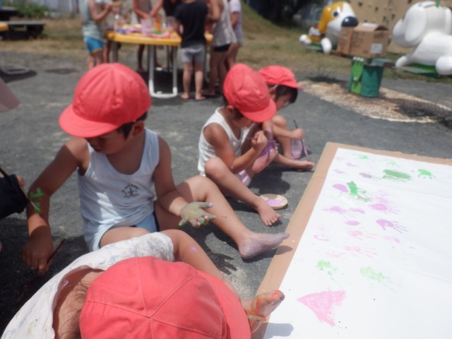 模造紙にいっぱいお絵かき手や足に絵の具をつけて